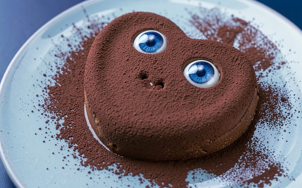<Изображение детально передает пористую текстуру какао-порошка и матовую поверхность шоколадного бисквита. Контраст между глубоким коричневым цветом основы и ярко-голубым глянцем глаз создает выразительный визуальный акцент. Мягкое освещение формирует плавные градиенты на изгибах сердца, подчеркивая объем объекта и создавая естественные тени на светлой тарелке. Перед загрузкой доступен удобный предпросмотр для оценки качества отображения всех элементов на вашем экране.