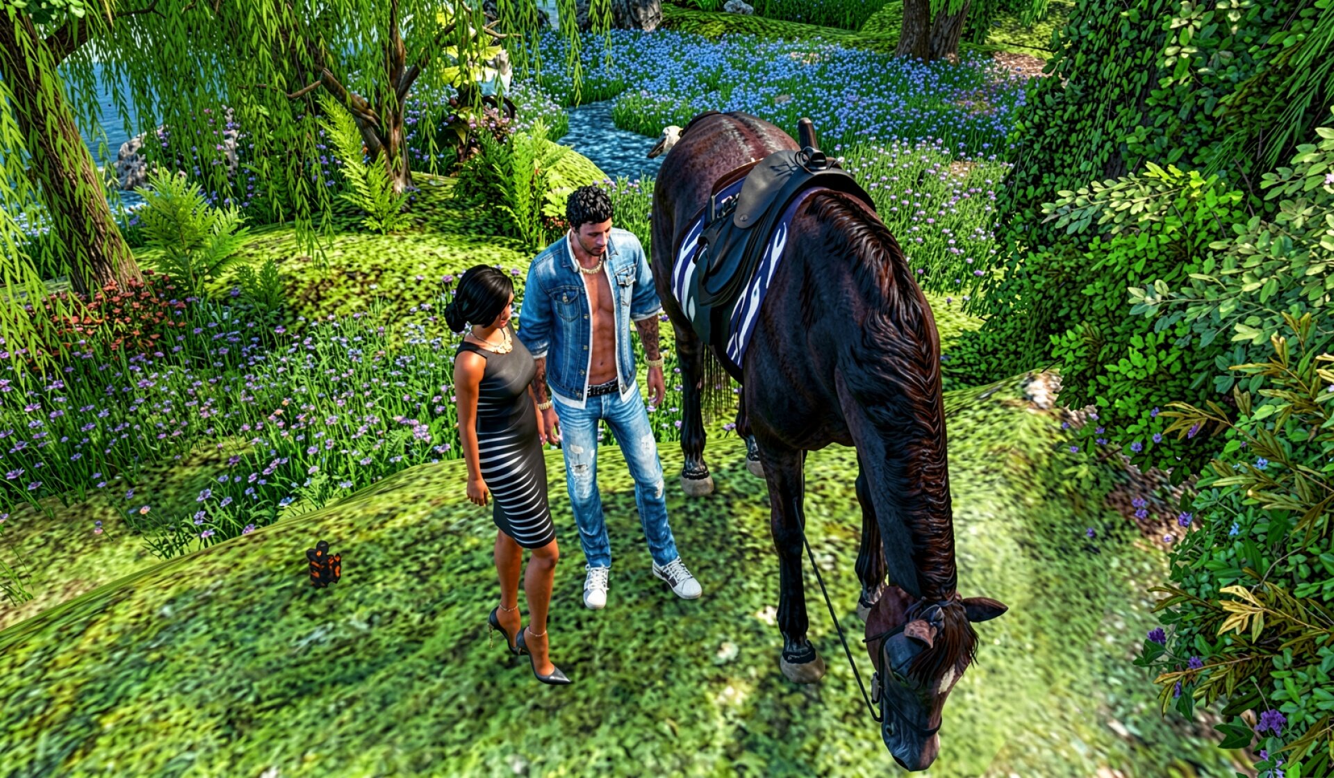 Композиция выполнена в стиле современного цифрового арта с акцентом на насыщенную зеленую палитру и естественные тени. В центре внимания находятся две фигуры и темная лошадь с седлом, расположенные на фоне цветущего сада с ивами и голубыми цветами. Технически изображение характеризуется высокой плотностью пикселей и правильным балансом белого, что исключает появление цифрового шума в темных участках шерсти животного. Согласно стандартам цветопередачи sRGB, которые описывает сайт adobe.com, такая гамма обеспечивает стабильное отображение оттенков на большинстве современных мониторов.
