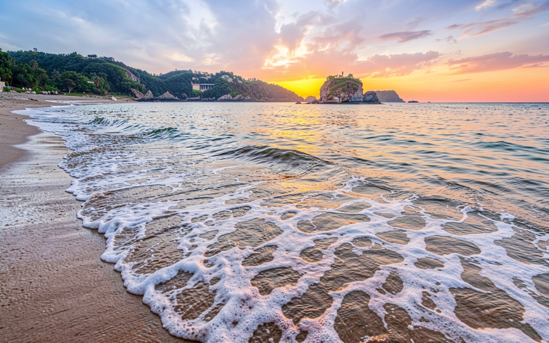 Техническое исполнение кадра фокусируется на детализации морской пены и градиентах вечернего неба. Освещение создает мягкие блики на поверхности воды, а глубокие тени подчеркивают рельеф прибрежных скал. Текстура влажного песка передает естественный блеск, дополненный плавным переходом цветов от золотистого к нежно-голубому. Перед загрузкой доступен удобный предпросмотр для оценки качества отображения на вашем экране.