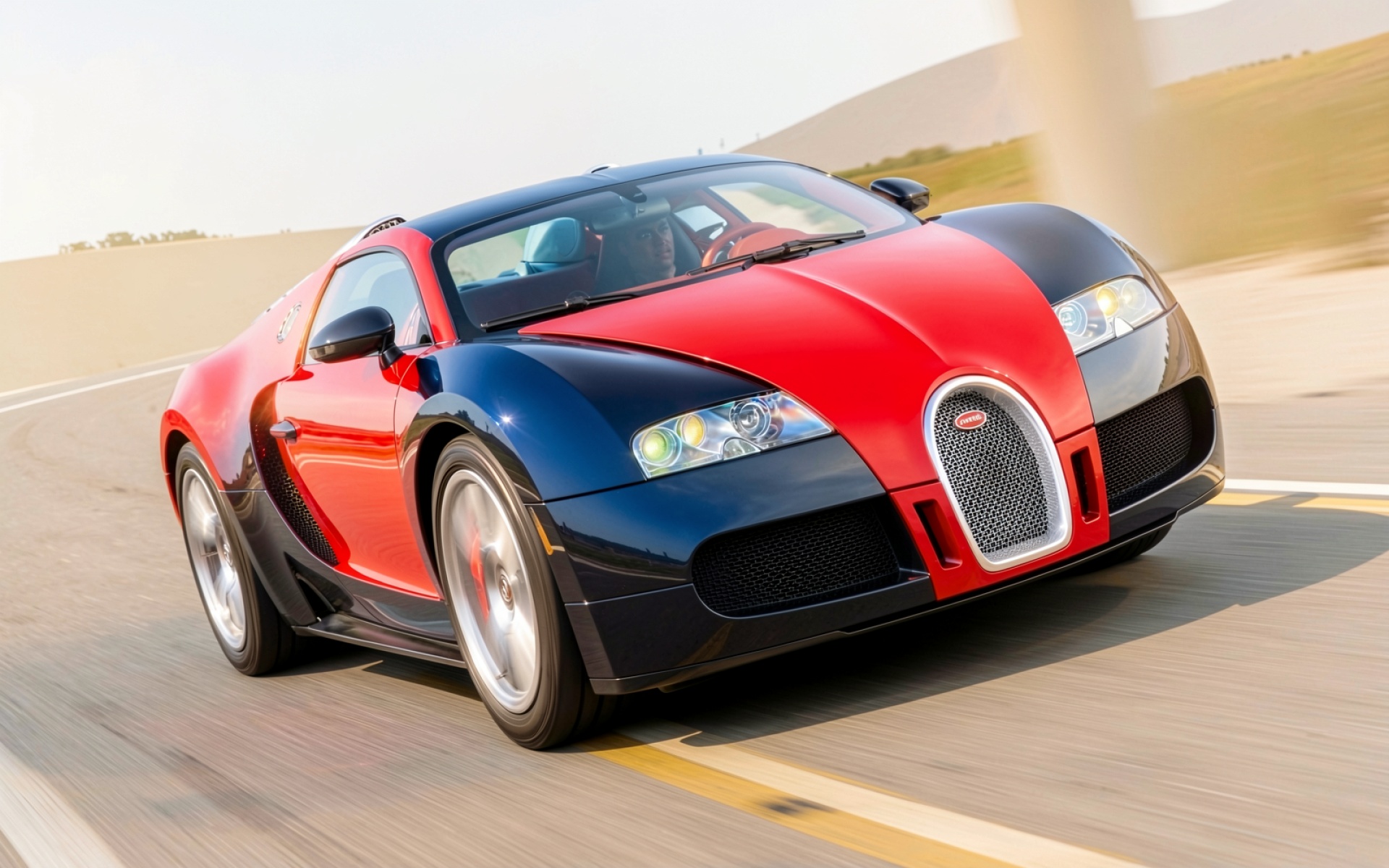 Техническая сложность модели заключается в использовании углепластика для снижения веса и установке восьми радиаторов для охлаждения двигателя W16. Согласно данным bugatti.com, этот гиперкар был спроектирован для преодоления барьера в 400 км/ч, что потребовало создания специальных шин от Michelin с усиленным каркасом. На снимке запечатлен эффект динамики движения на открытой трассе, что передает ощущение скорости и премиального статуса владельца.