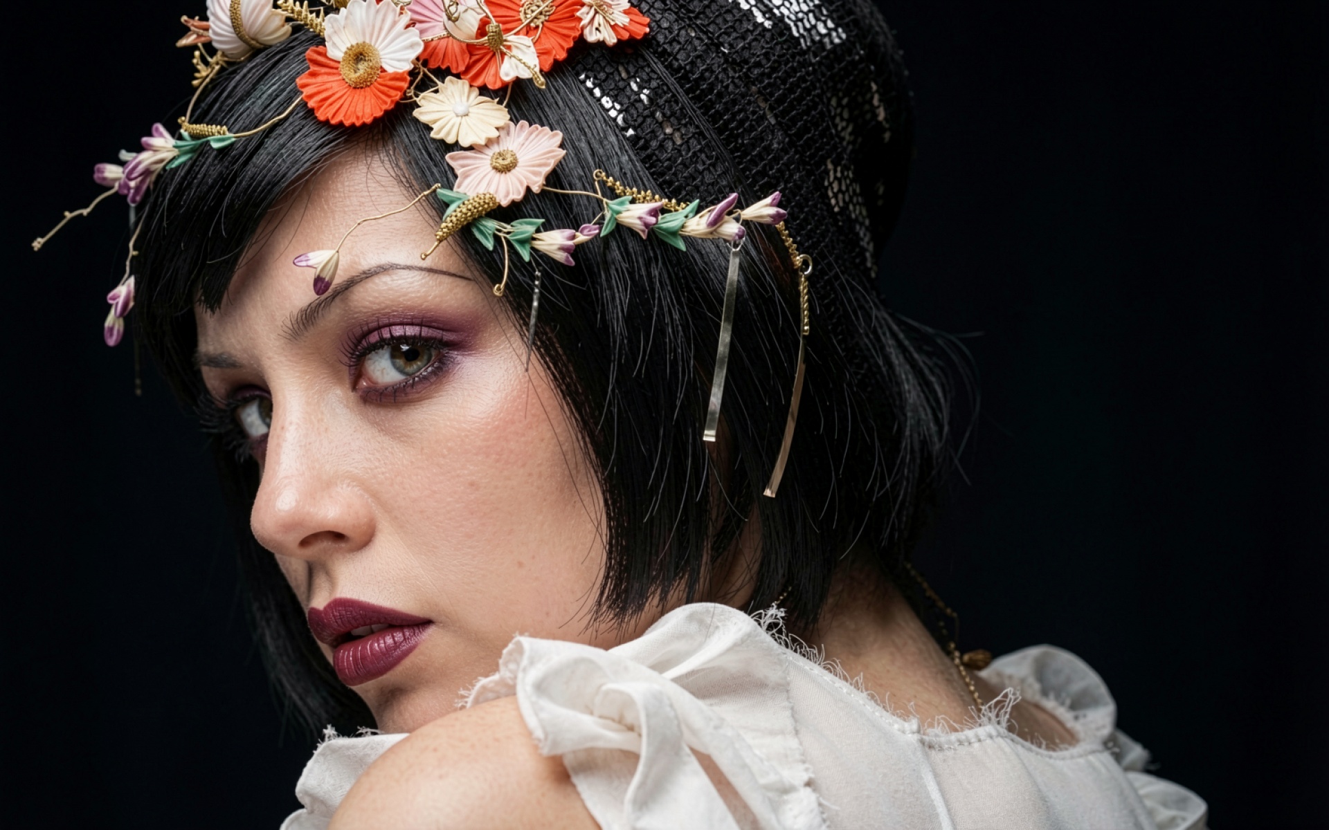 Изображение фокусируется на детальной текстуре лепестков искусственных цветов и переплетении тонких золотистых нитей. Контрастное освещение подчеркивает матовый финиш помады и мягкие градиенты кожи, создавая глубокий объем на фоне абсолютной темноты. Акценты света выделяют отдельные пряди черных волос и изгибы ткани белого платья. На сайте доступен удобный предпросмотр перед скачиванием для оценки качества на экране.