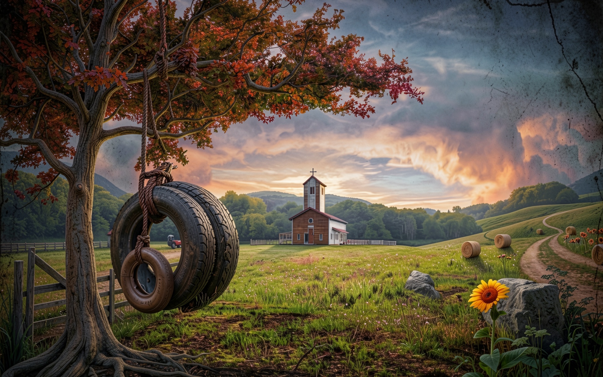 Изображение детально передает текстуру старой резины качелей и грубую кору дерева. Освещение имитирует закатный час, создавая мягкие градиенты на небе и глубокие тени в густой траве. Контраст между ярко-оранжевой листвой и приглушенными тонами сельской церкви подчеркивает объем сцены. На сайте доступен удобный предпросмотр перед скачиванием, чтобы оценить качество отображения всех элементов на вашем экране.