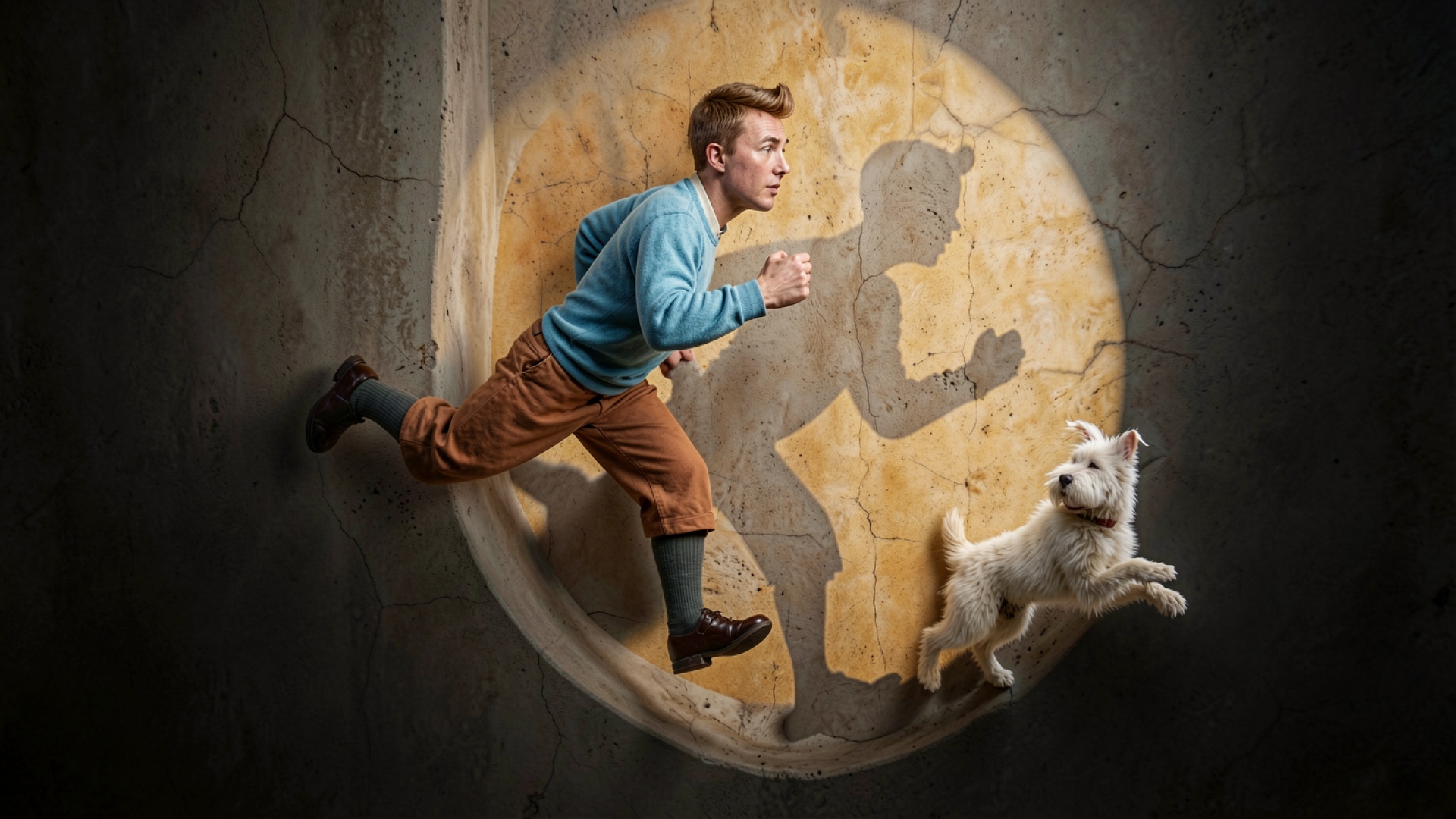 Изображение выделяется контрастом между темными бетонными стенами и теплым золотистым освещением центральной зоны. Текстура шерсти собаки и ткань голубого джемпера переданы с высокой детализацией, а мягкие градиенты света создают объемный эффект. Особое внимание уделено динамическим теням на заднем плане, которые подчеркивают движение персонажей. Перед загрузкой доступен удобный предпросмотр для оценки качества отображения всех элементов на вашем экране