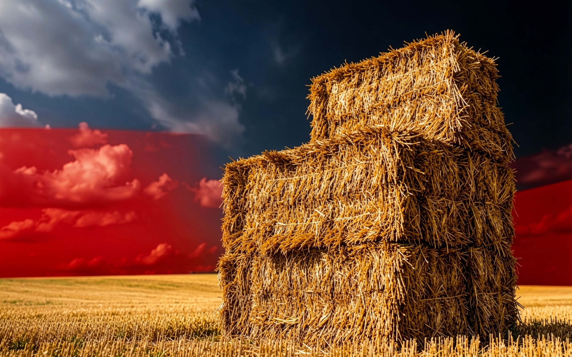 Изображение детально передает грубую текстуру сухой соломы и четкие линии спрессованных блоков. Контрастное освещение создает глубокие тени в складках сена и яркие блики на верхних гранях стогов. Фон характеризуется плавным градиентом от насыщенного алого до темно-синего, что подчеркивает объем центральных объектов. На сайте доступен удобный предпросмотр перед скачиванием для оценки качества отображения на экране.