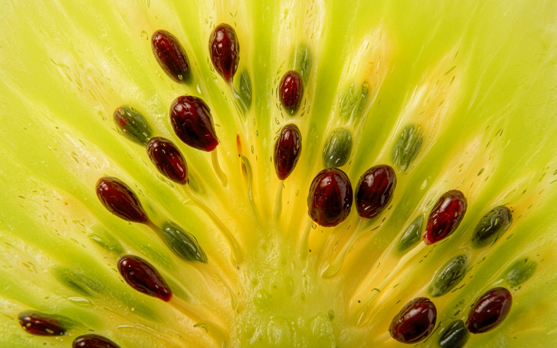 Данное изображение демонстрирует детальную текстуру мякоти с плавными радиальными градиентами от светло-желтого к насыщенному зеленому. Особое внимание уделено глянцевой поверхности семян и микроскопическим каплям влаги, которые создают естественные блики и глубокие тени. Контраст между темными зернами и светлым фоном подчеркивает объем каждой детали. На сайте доступен удобный предпросмотр перед загрузкой для оценки качества отображения на вашем экране.