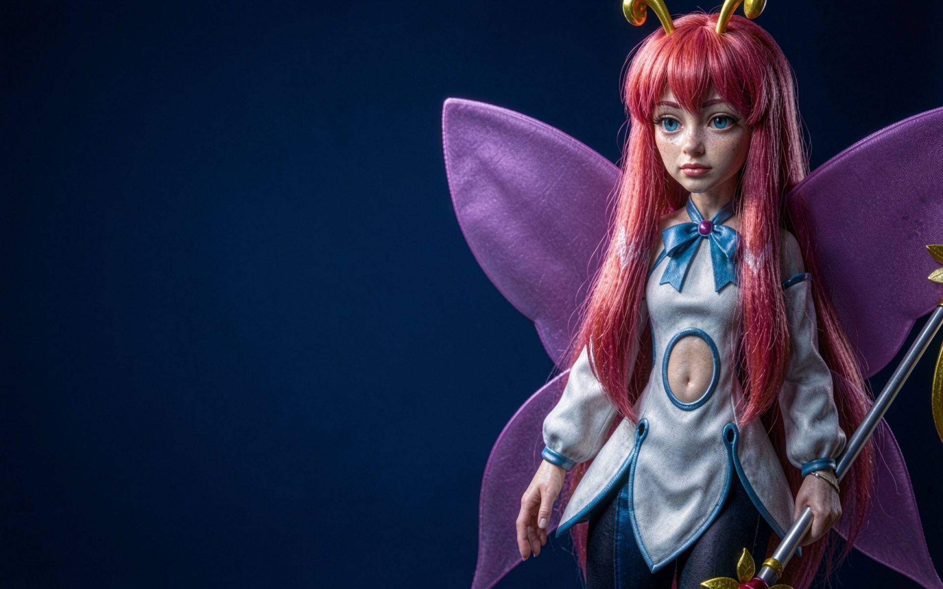 Изображение отличается детальной проработкой текстуры ткани платья и мягким переливом розовых оттенков волос. Освещение создает четкие блики на поверхности крыльев и глубокие тени в складках одежды, что придает фигуре объем. Градиент темно-синего фона подчеркивает контраст с яркими элементами образа. Перед загрузкой доступен удобный предпросмотр для оценки качества отображения всех деталей на вашем экране.