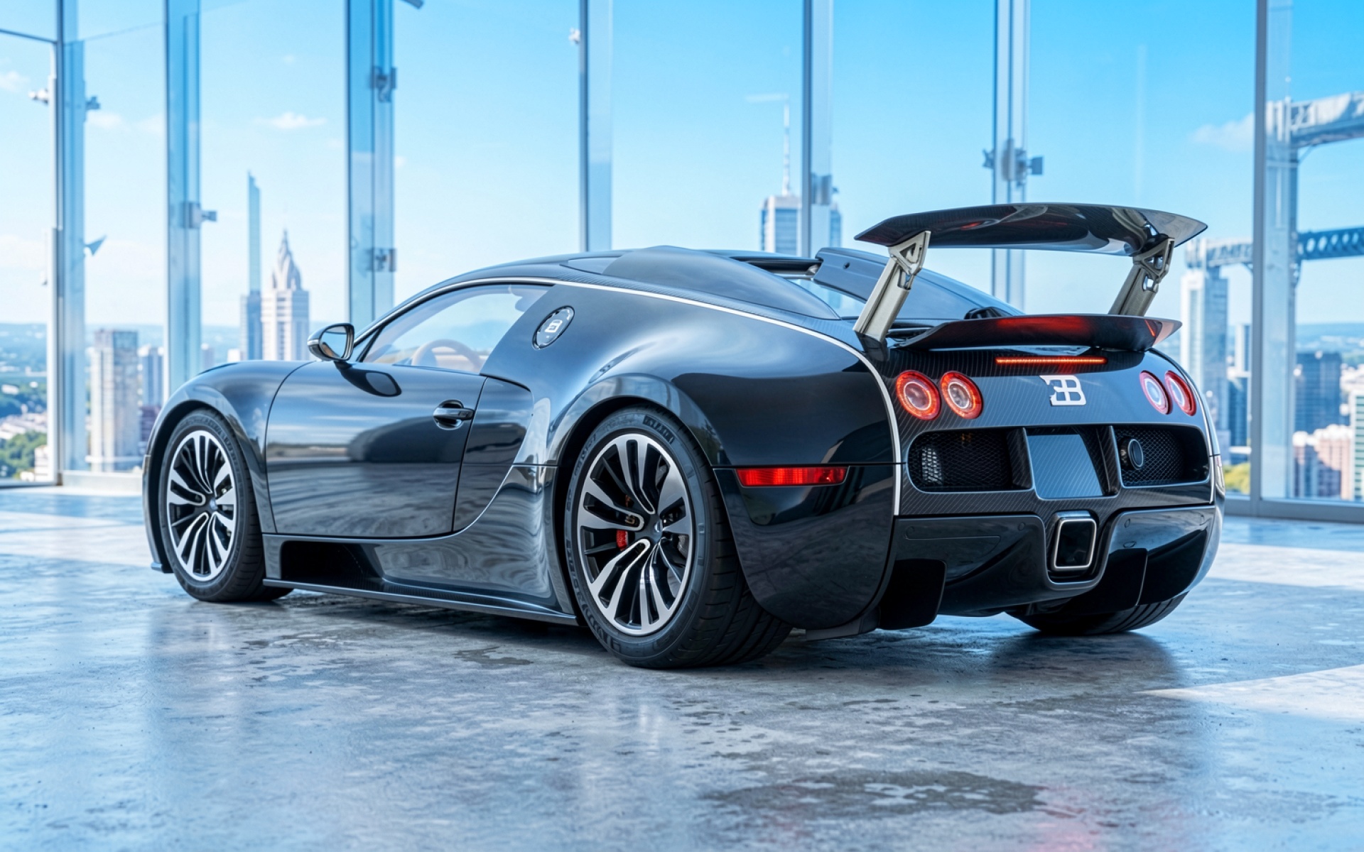 Черный Bugatti Veyron на фоне городских небоскребов обои