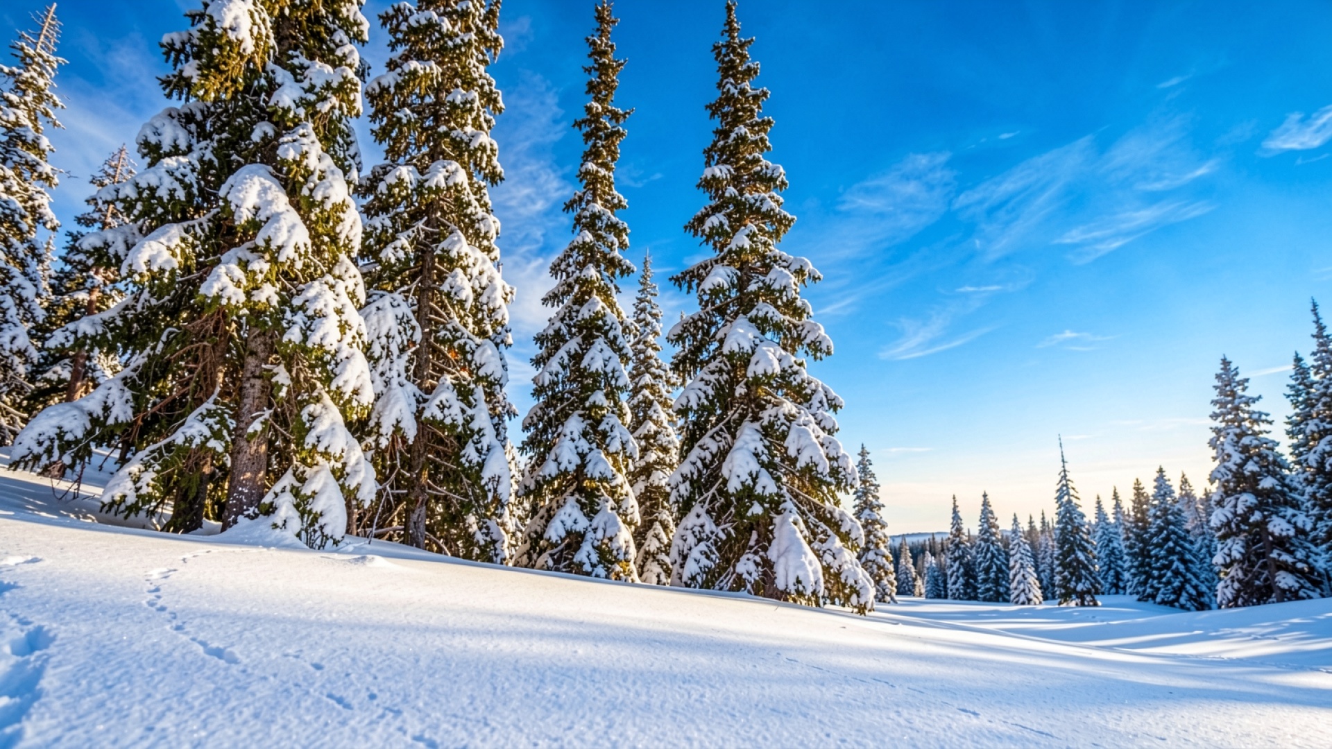 Техническое исполнение кадра акцентирует внимание на текстуре свежевыпавшего снега и иголок хвойных деревьев. Освещение создает мягкие переходы между яркими бликами на заснеженных ветвях и глубокими тенями в гуще леса. Градиент голубого неба плавно переходит к горизонту, подчеркивая объем композиции. Перед загрузкой доступен удобный предпросмотр, чтобы оценить качество цветопередачи на вашем экране.