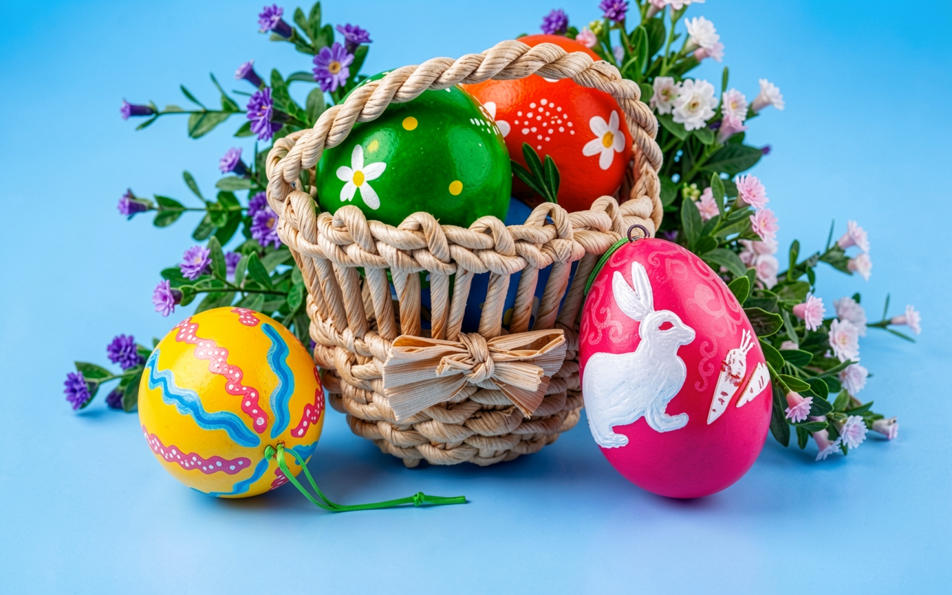 Пасхальные яйца в плетеной корзине на голубом фоне обои