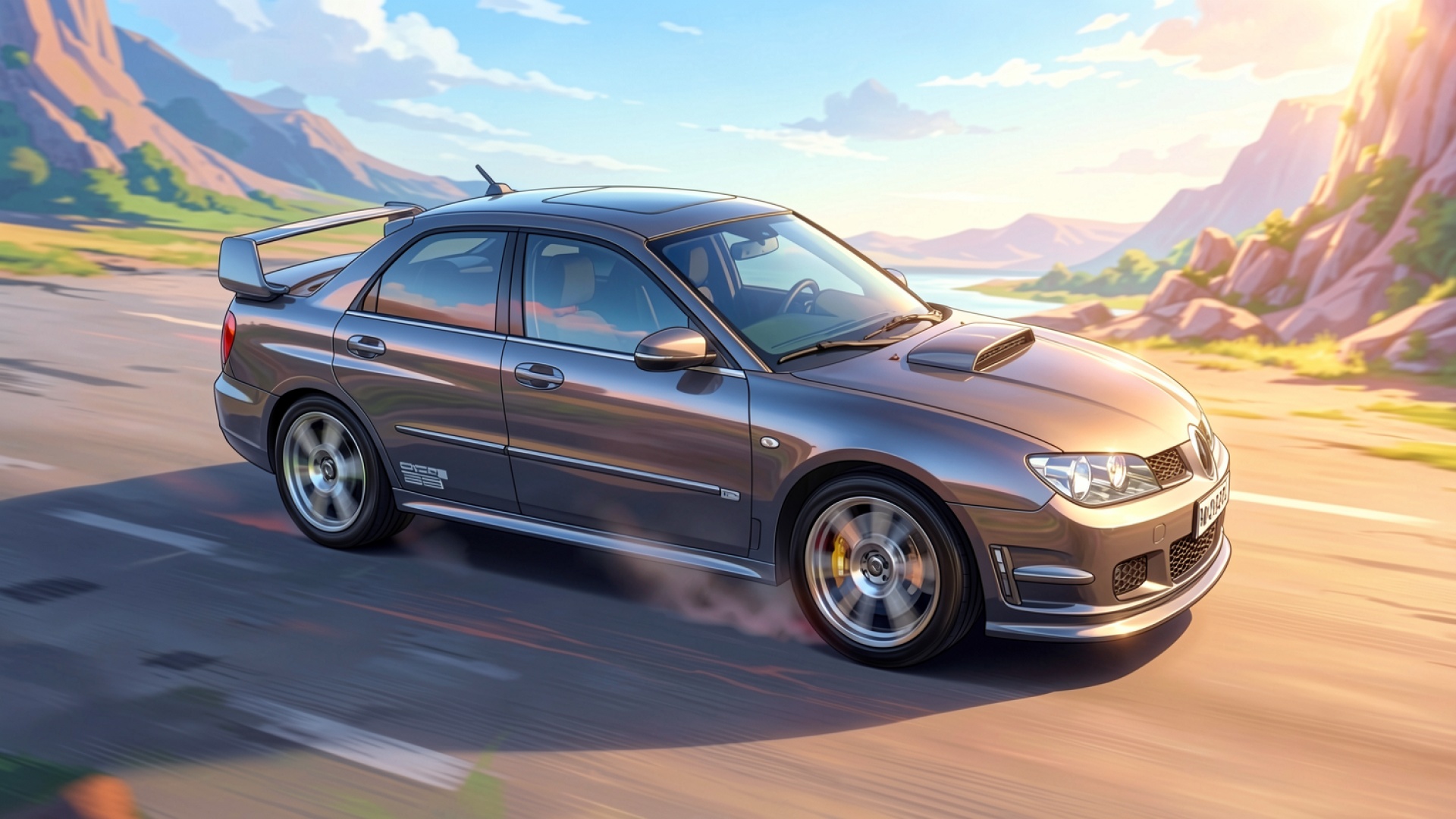 Изображение детально передает металлический блеск кузова с плавными градиентами серого цвета. Освещение имитирует закатное солнце, создавая яркие блики на капоте и глубокие тени под днищем машины. Текстура асфальта подчеркнута эффектом размытия в движении, а задний план с горным ландшафтом дополняет композицию мягким освещением. На сайте доступен удобный предпросмотр перед скачиванием для оценки качества на экране.