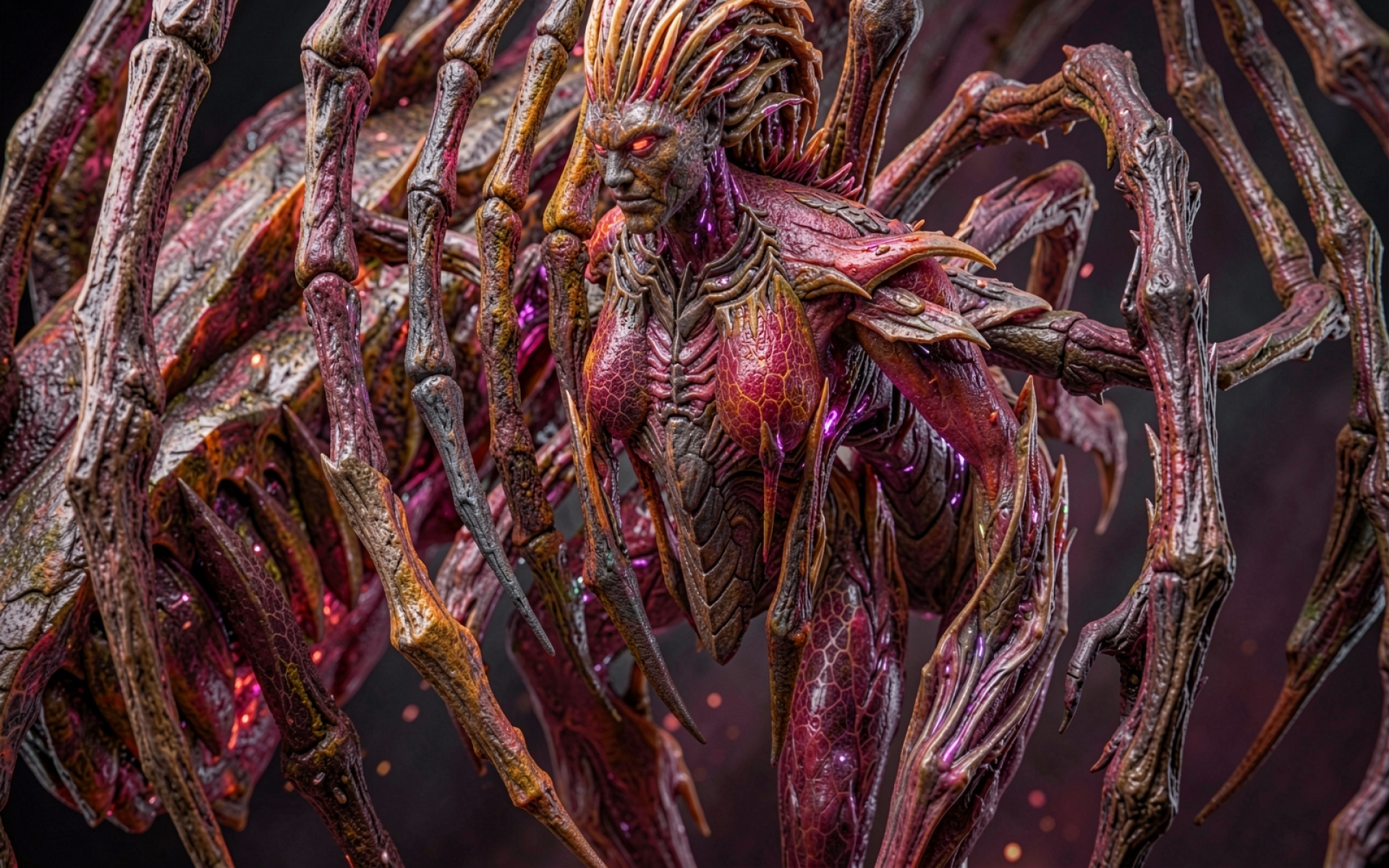 Визуальный ряд характеризуется высокой плотностью текстур: виден хитиновый панцирь, сегментированные конечности и светящиеся пурпурные вкрапления. Анатомия существа сочетает человеческие черты лица с многоногим телом членистоногого. Подобный стиль биомеханики был популяризирован художником Гансом Гигером, чьи работы анализируются на artstation.com как эталон синтеза плоти и металла. Технически изображение обладает высоким контрастом и четкой прорисовкой микродеталей кожи и панциря, что делает его подходящим для 4K мониторов.