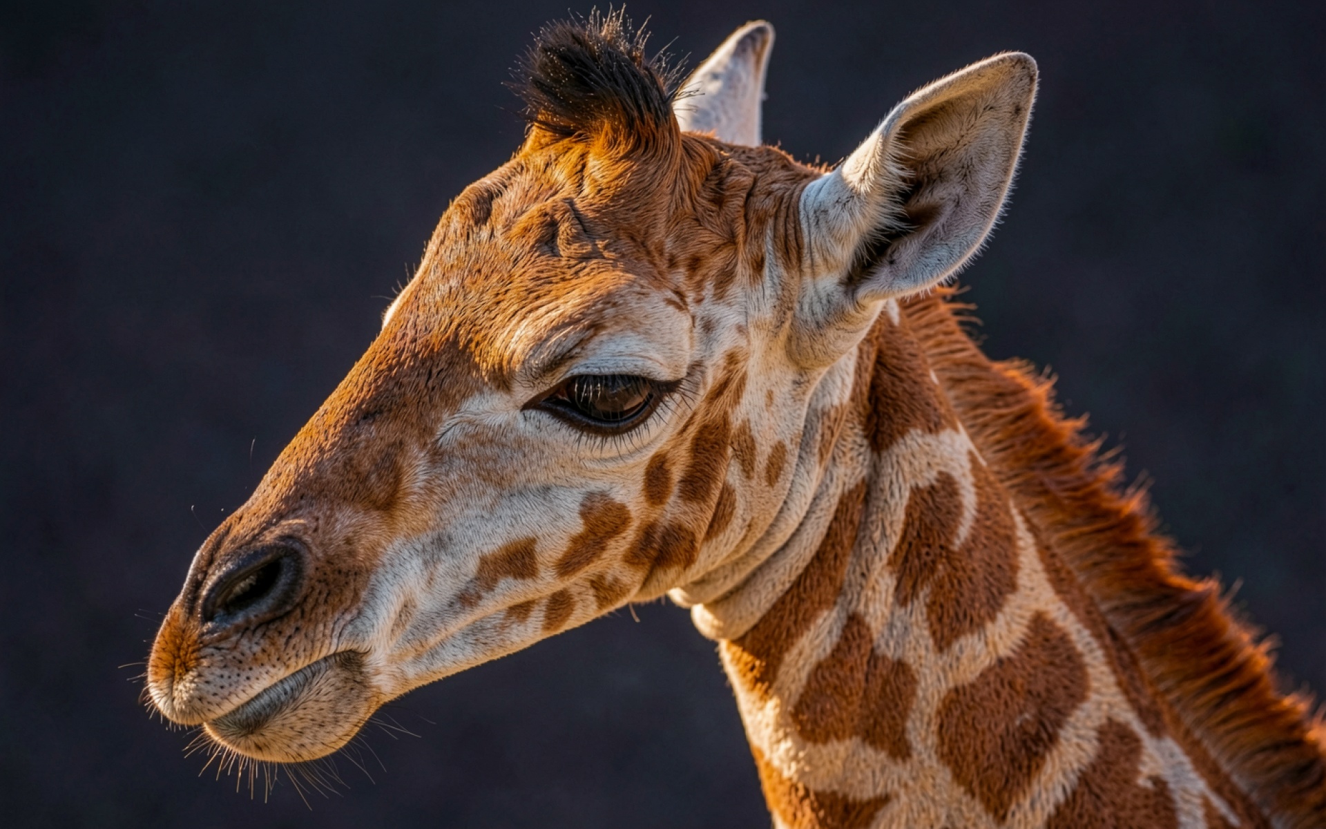 Изображение детально передает текстуру шерсти и характерный сетчатый рисунок кожи животного. Контрастное освещение создает четкие блики на морде и глубокие тени в области шеи, подчеркивая анатомические особенности. Плавный градиент темного фона акцентирует внимание на теплых рыжих оттенках объекта. На сайте доступен удобный предпросмотр перед загрузкой для оценки качества отображения на экране.