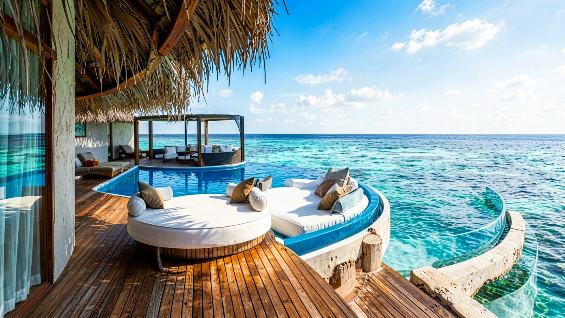 Изображение детально передает текстуру натурального дерева на террасе и плетение соломенной крыши. Освещение имитирует яркий зенитный свет, создавая четкие контрастные тени и выраженные блики на поверхности воды в бассейне. Градиенты бирюзового цвета плавно переходят от светлых прибрежных оттенков к глубокому синему горизонту. Сайт предоставляет удобный предпросмотр перед скачиванием для оценки качества на экране.