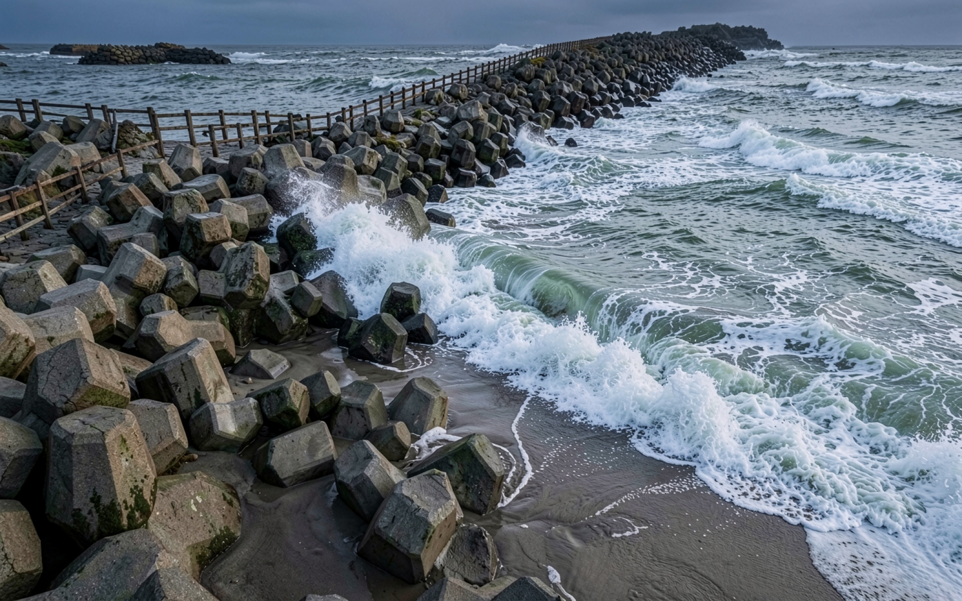 Согласно данным из engineeringtoolbox.com, тетраподы и подобные волнорезы проектируются таким образом, чтобы максимально рассеивать энергию волны за счет своей геометрии, предотвращая эрозию береговой линии. Нажмите кнопку скачивания, чтобы установить эти обои с волнорезами на ваш ПК или телефон прямо сейчас.