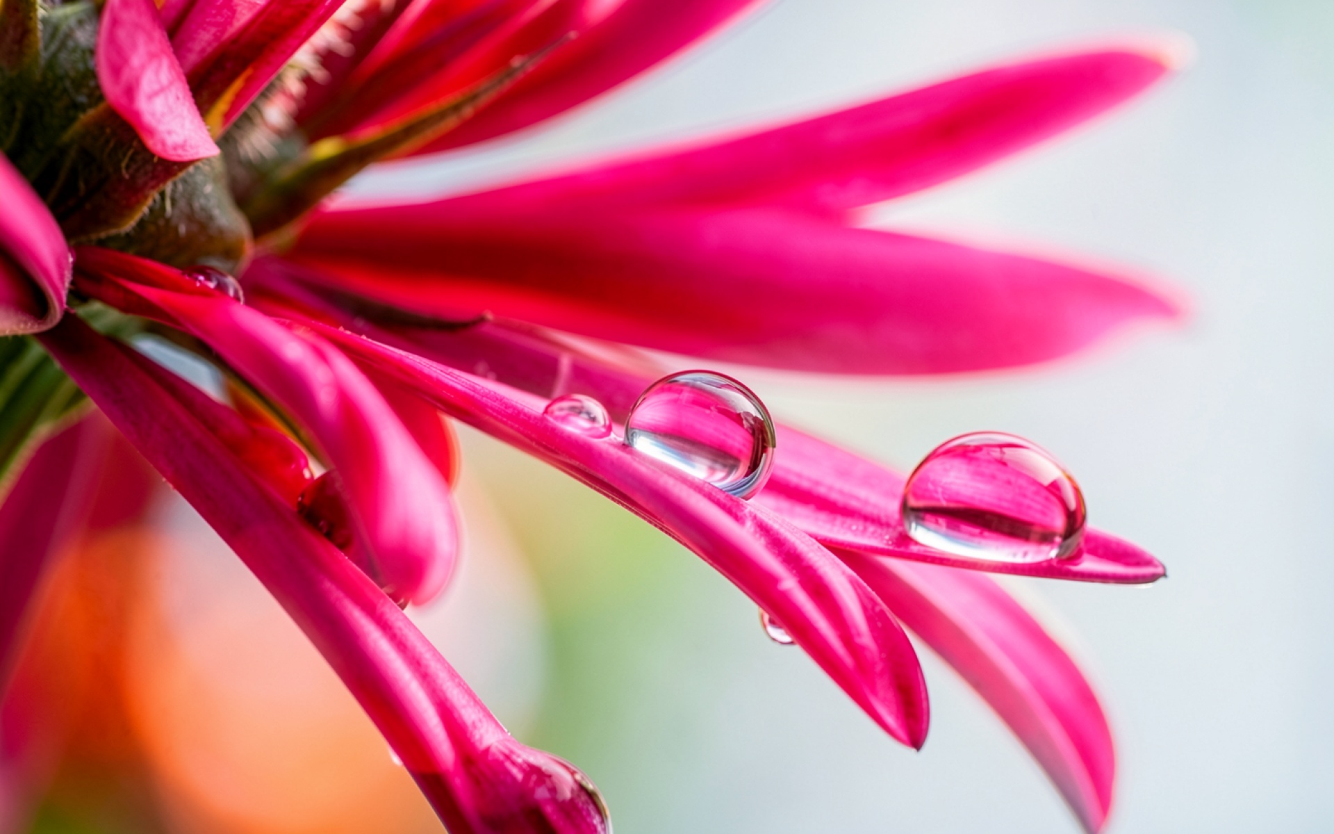 Изображение демонстрирует детальную текстуру лепестков с плавными переходами насыщенного розового цвета. Освещение создает мягкие блики на поверхности водяных сфер, которые работают как линзы, преломляя окружающий фон. Глубокие тени в основании цветка контрастируют со светлым градиентом заднего плана. На сайте доступен удобный предпросмотр перед скачиванием для оценки качества на экране.