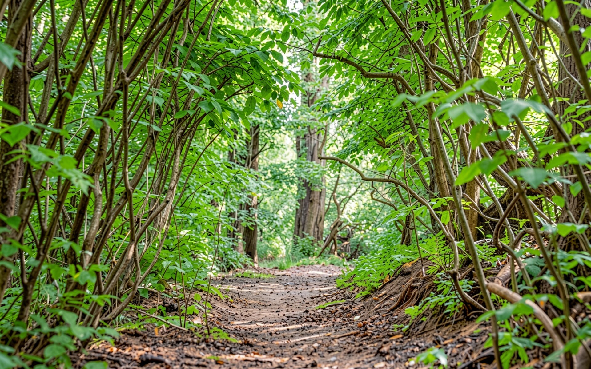 Изображение передает детальную текстуру коры деревьев и мягкий градиент листвы. Освещение имитирует естественный солнечный свет, пробивающийся сквозь кроны, что создает контрастные тени на грунтовой поверхности тропы. Акценты расставлены на переднем плане через четкие линии ветвей и насыщенные зеленые оттенки растительности. На сайте доступен удобный предпросмотр перед скачиванием для оценки качества на экране.