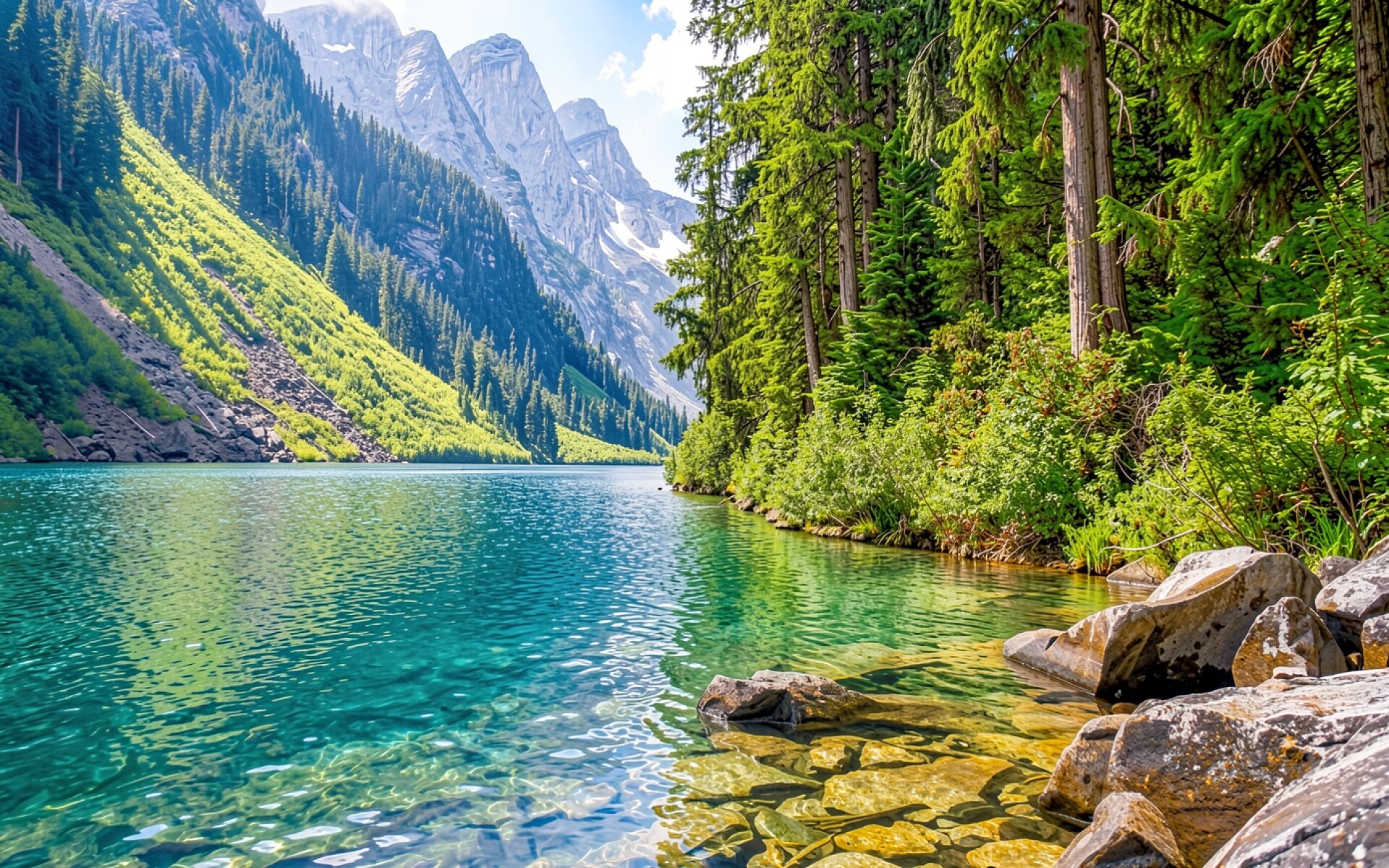 Изображение характеризуется высокой детализацией текстур горных пород и хвои. Освещение имитирует яркий дневной свет, создавая четкие блики на водной глади и глубокие тени в гуще леса. Градиенты фона плавно переходят от насыщенного бирюзового цвета воды к светло-голубому небу. На сайте доступен удобный предпросмотр перед скачиванием для оценки качества на экране.