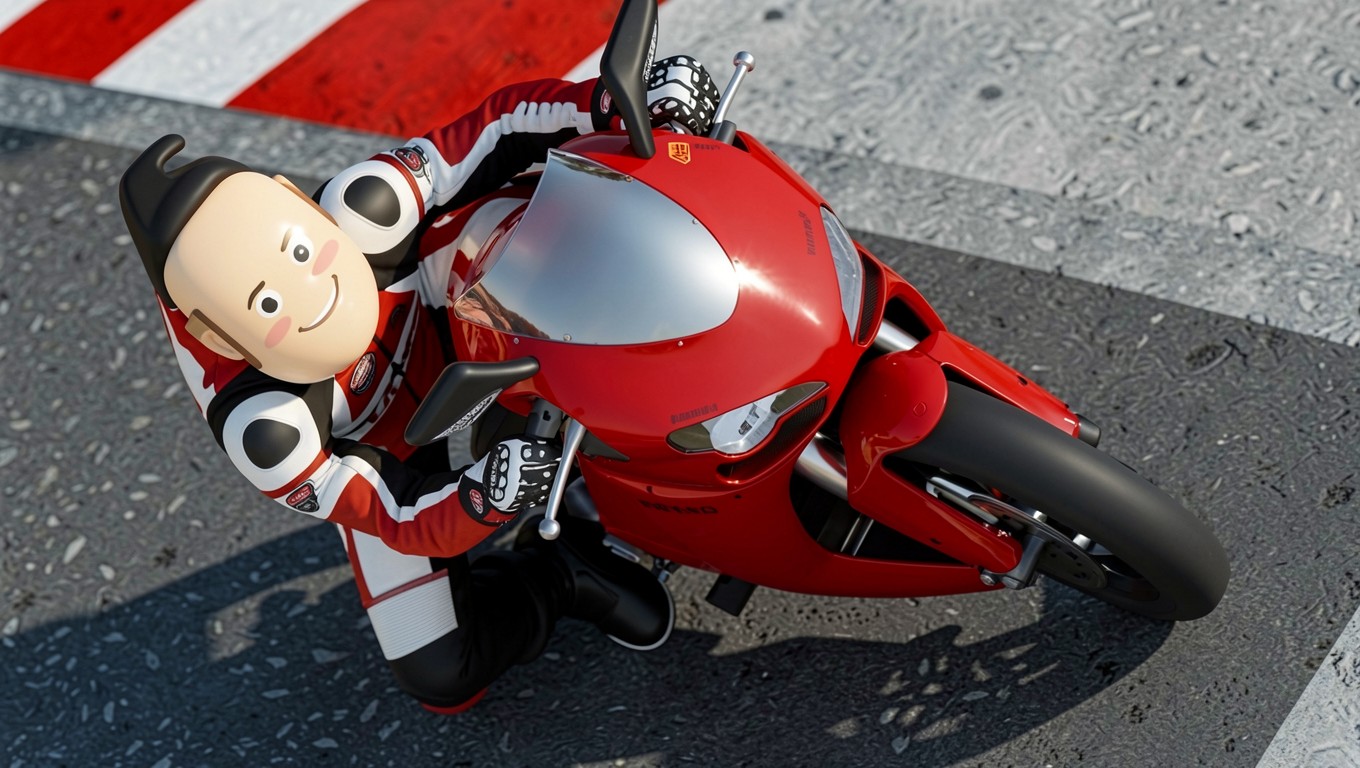 Мультяшный гонщик на красном спортивном мотоцикле обои