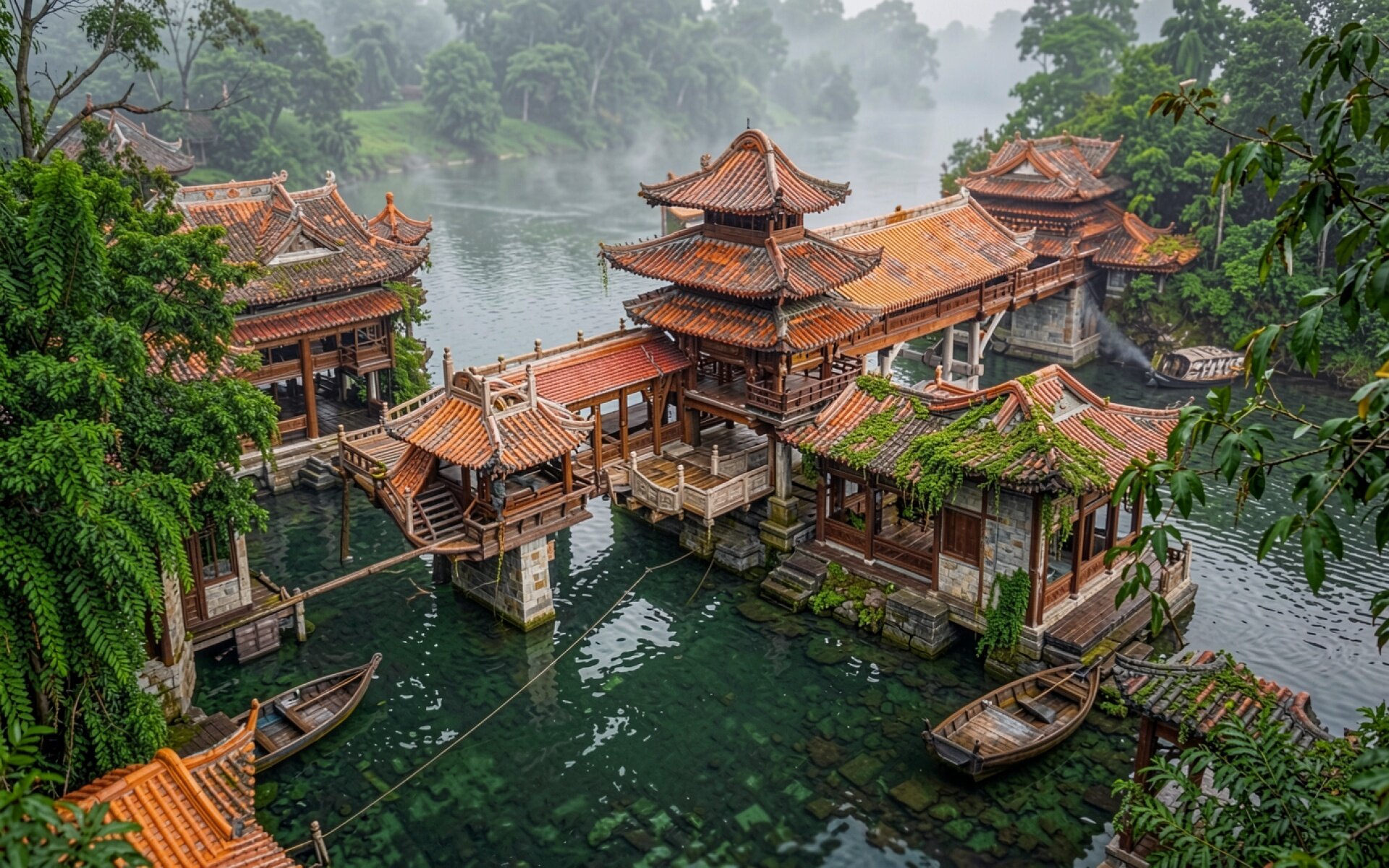 Изображение детально передает текстуру старого дерева и черепицы крыш с характерным изгибом. Мягкое рассеянное освещение создает плавные градиенты в тумане, а глубокие тени под навесами подчеркивают объем архитектурных форм. Отражения павильонов в темной воде дополняют композицию естественными бликами. На сайте доступен удобный предпросмотр перед скачиванием для оценки качества на экране.