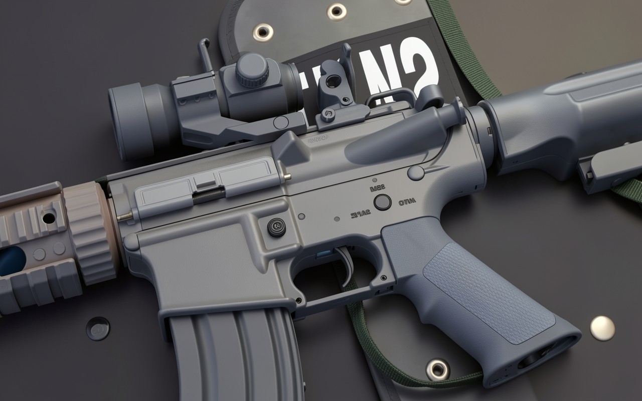 Изображение детально передает матовую текстуру полимерного приклада и металла ствольной коробки. Освещение создает мягкие градиенты на плоских поверхностях, подчеркивая четкость граней и геометрию тактического прицела. Контраст между серым корпусом оружия и темным фоном выделяет мелкие технические элементы и заклепки. На сайте доступен удобный предпросмотр перед скачиванием для оценки качества на экране.
