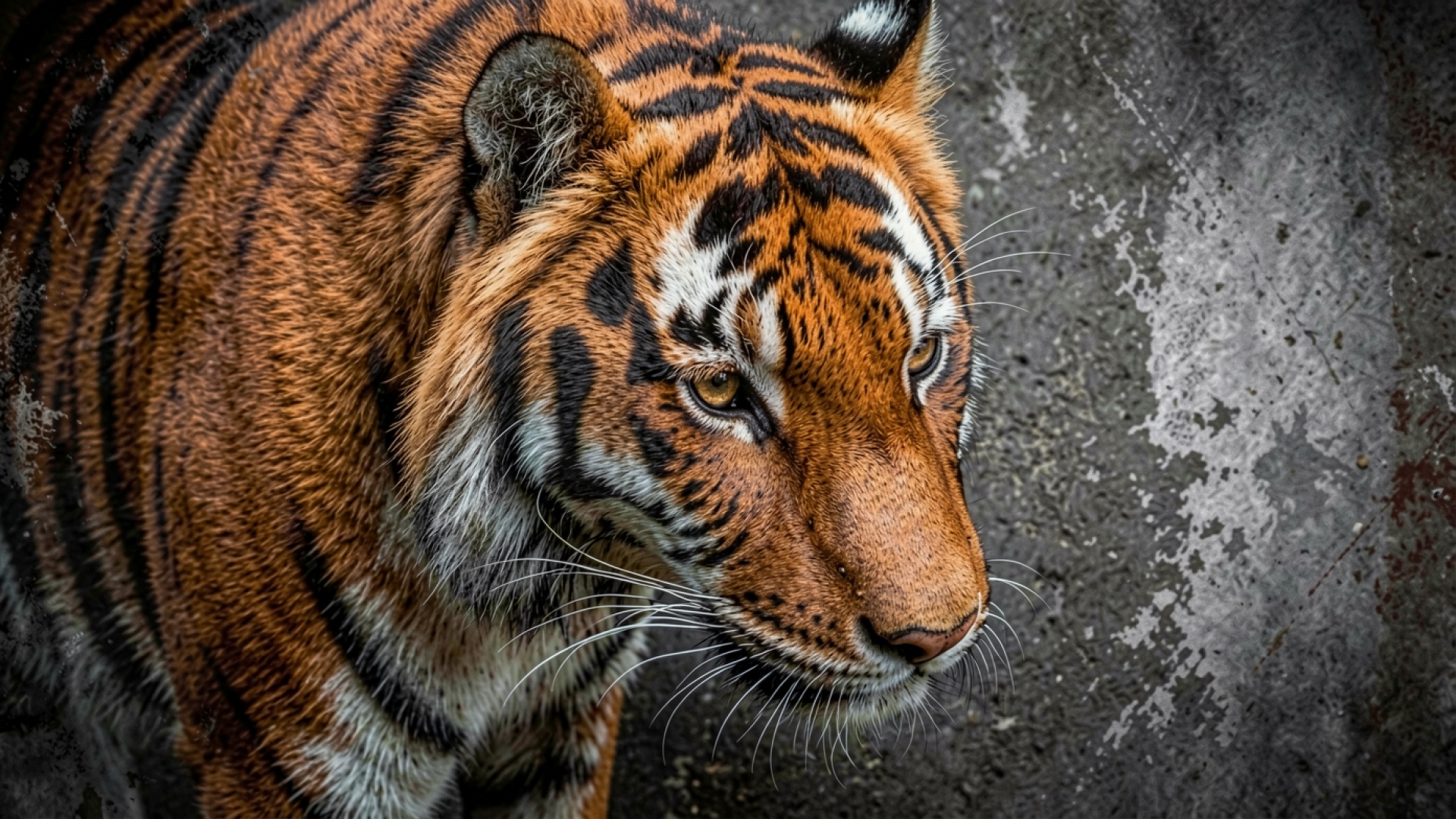 Изображение детально передает текстуру густого меха с четким разделением оранжевых и черных полос. Освещение направленное, что создает глубокие тени в складках кожи и яркие блики на вибриссах. Серый бетонный фон имеет неоднородную зернистую структуру с плавными переходами тонов, которые подчеркивают контраст с теплым цветом шерсти животного. Перед загрузкой доступен удобный предпросмотр для оценки качества отображения всех деталей на вашем экране.