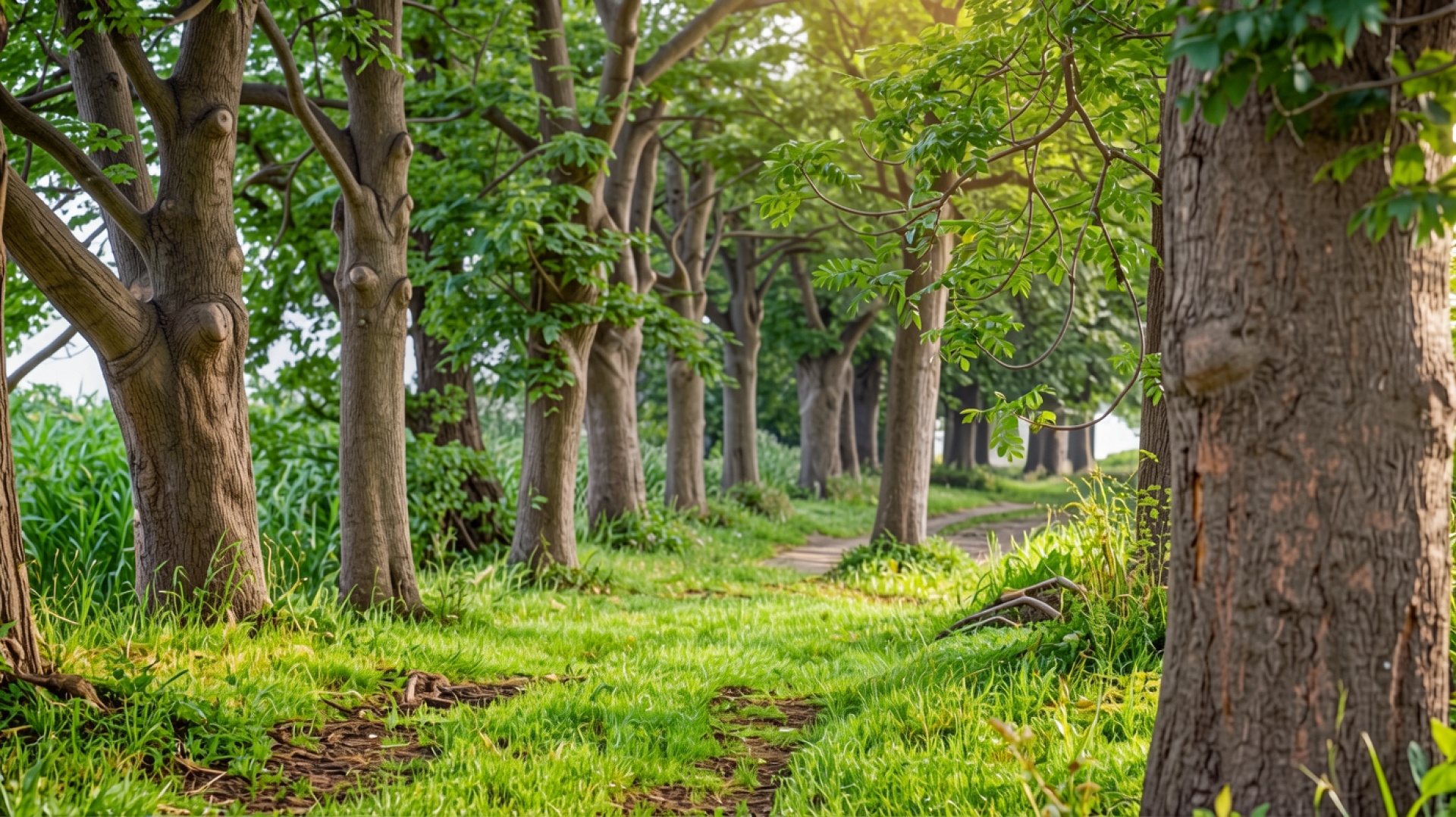 Изображение детально передает текстуру коры стволов и насыщенный оттенок листвы. Мягкое естественное освещение создает плавные градиенты на траве и выраженные блики в кронах, подчеркивая объем каждой ветви. Глубокие тени под деревьями создают контраст с ярко освещенными участками тропинки. На сайте доступен удобный предпросмотр перед загрузкой для оценки качества отображения на экране.