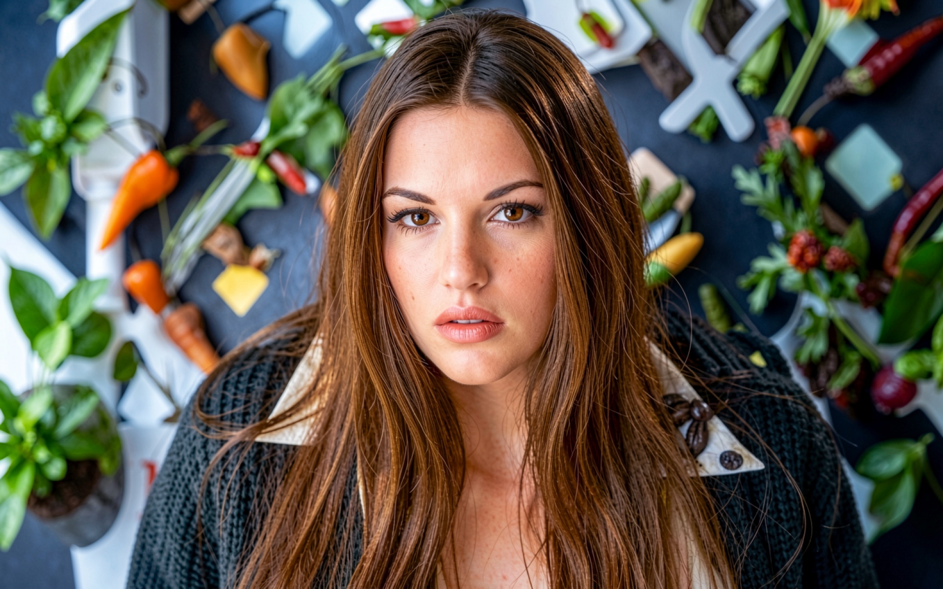 Техническое исполнение кадра акцентирует внимание на текстуре кожи и естественном блеске волос. Освещение распределено равномерно, создавая мягкие переходы между светлыми участками лица и глубокими тенями в складках темного кардигана. Фон с разбросанными овощами характеризуется высокой контрастностью и насыщенными цветовыми градиентами, что придает композиции объем. Перед загрузкой доступен удобный предпросмотр для оценки качества отображения на вашем экране.