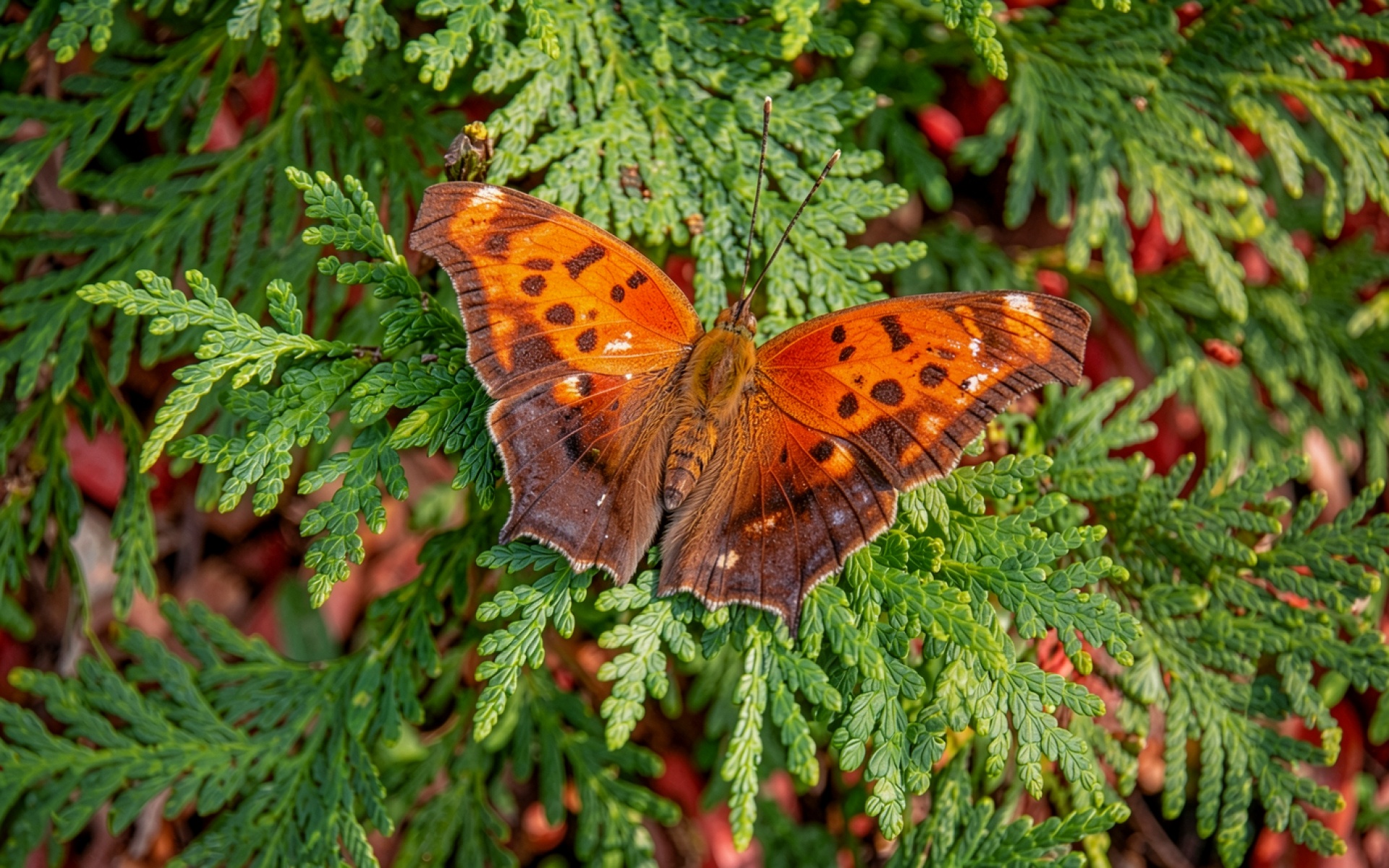На нашем сайте вы можете скачать JPG файл обоев 'Рыжая бабочка на ветках зеленого туи', и вот почему это важно: здесь нет полос градиента из-за низкого битрейта.