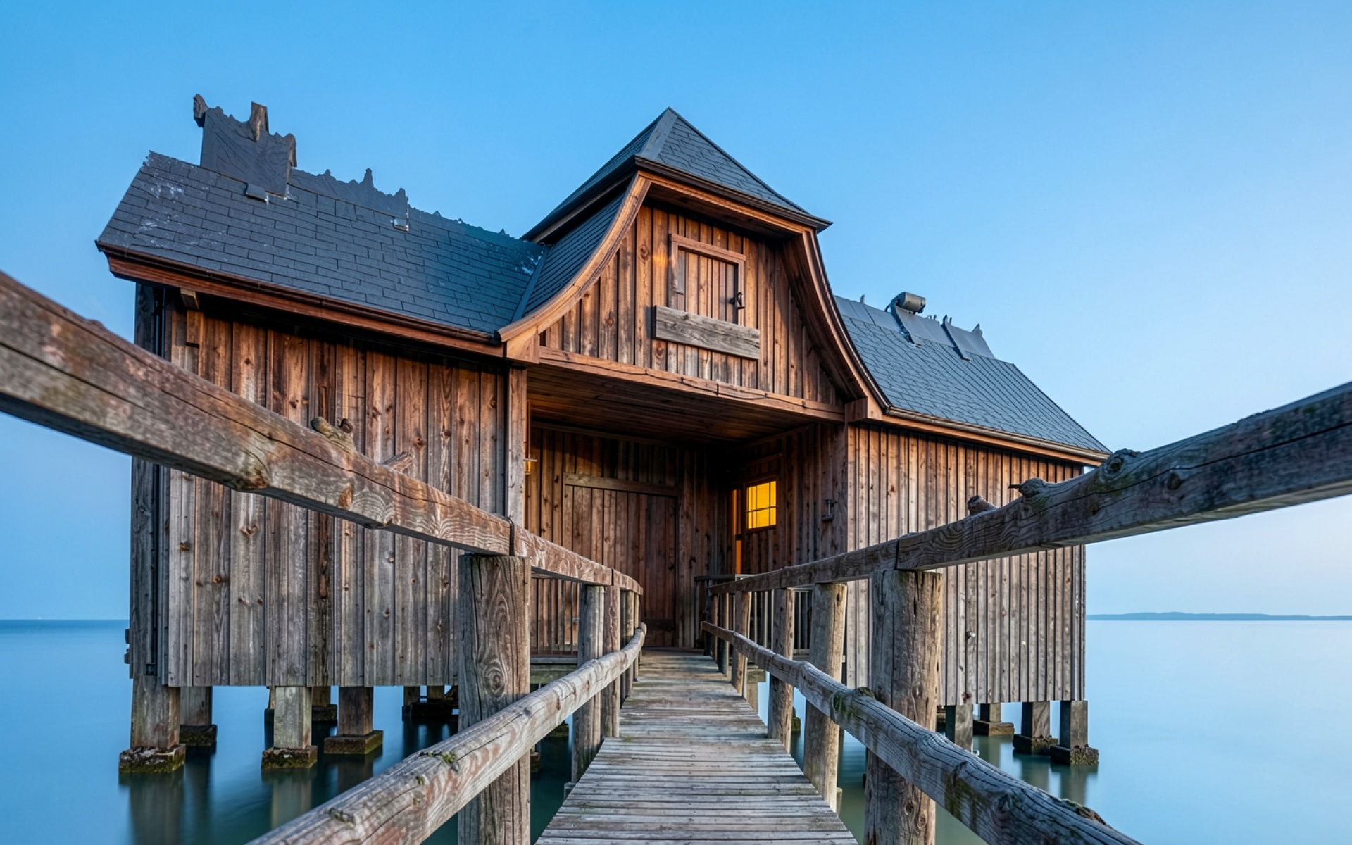 Скачайте JPG файл обоев Деревянный дом на сваях в синих сумерках на нашем сайте – и вот причина: файл оптимизирован для установки на рабочий стол и экран телефона.