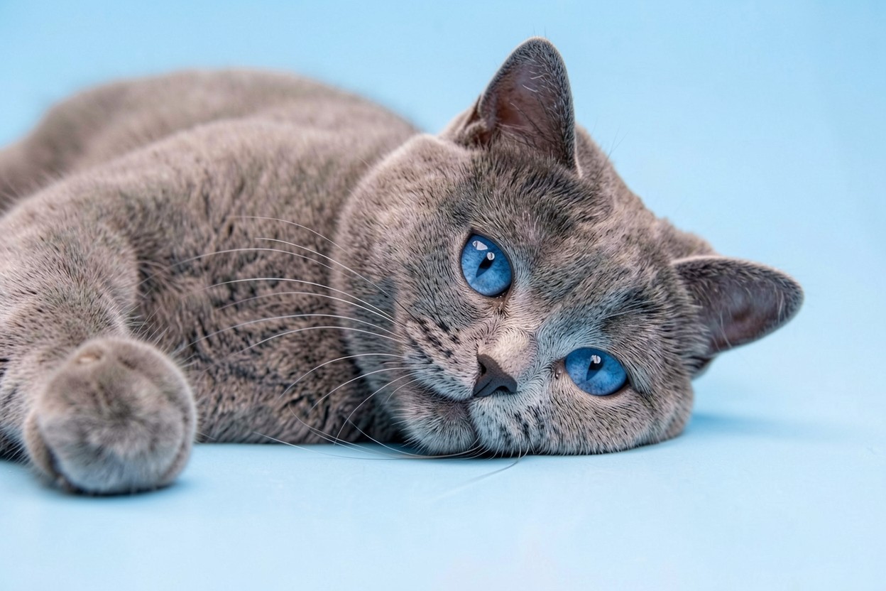 Изображение детально передает текстуру короткой шерсти и мягкие переходы серого цвета. Освещение акцентирует внимание на радужке глаз, создавая четкие блики и глубокий синий тон. Фон представляет собой однородный градиент, который подчеркивает контуры животного без лишних визуальных шумов. На сайте доступен удобный предпросмотр перед скачиванием для оценки качества на экране.