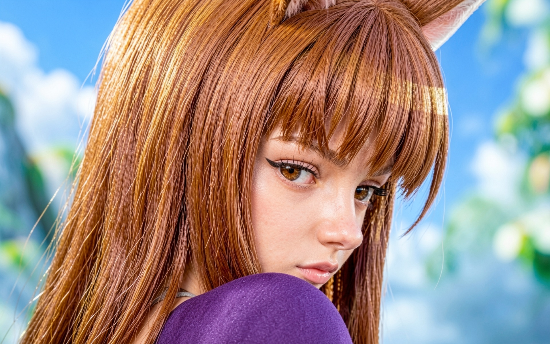 Изображение отличается детальной проработкой текстуры волос и ткани. Мягкое освещение создает плавные переходы между бликами на рыжих прядях и глубокими тенями в складках фиолетового платья. Фон с градиентом голубого неба дополняет общую композицию, создавая контраст с теплыми оттенками кожи. На сайте доступен удобный предпросмотр перед скачиванием для оценки качества на экране.