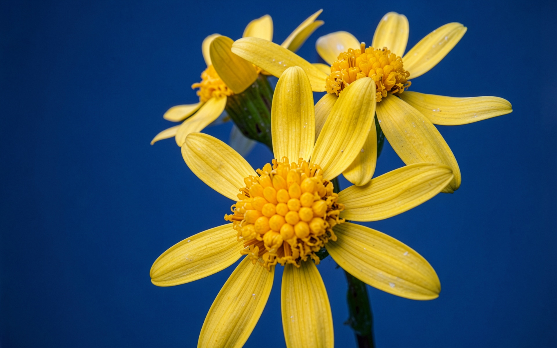 Желтые цветы на темно-синем однотонном фоне обои