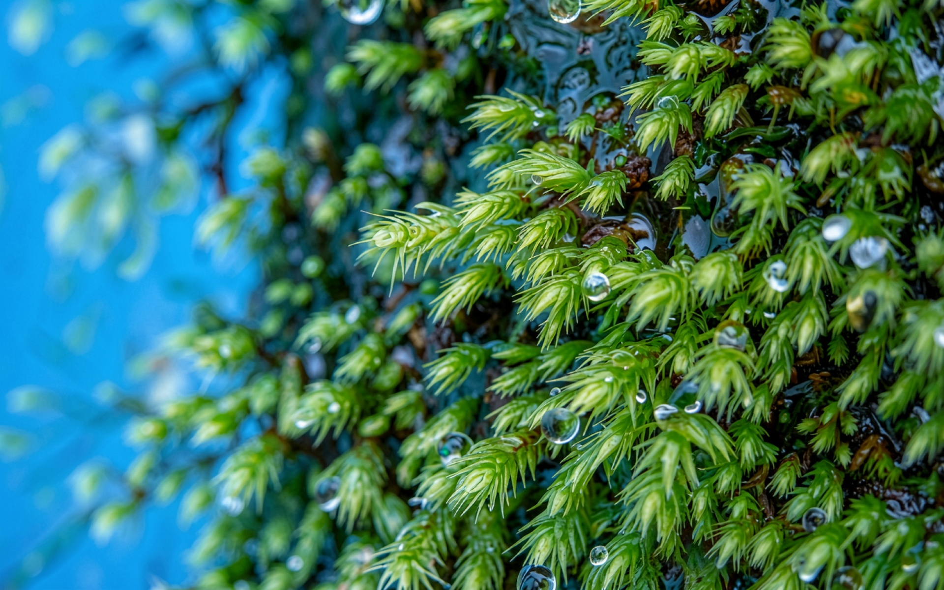 Изображение детально передает ворсистую текстуру мха и сферическую форму прозрачных капель. Освещение создает мягкие блики на поверхности воды и глубокие тени между стеблями растений, а плавный синий градиент фона подчеркивает насыщенность зеленого цвета. На сайте доступен удобный предпросмотр перед скачиванием для оценки качества на экране.