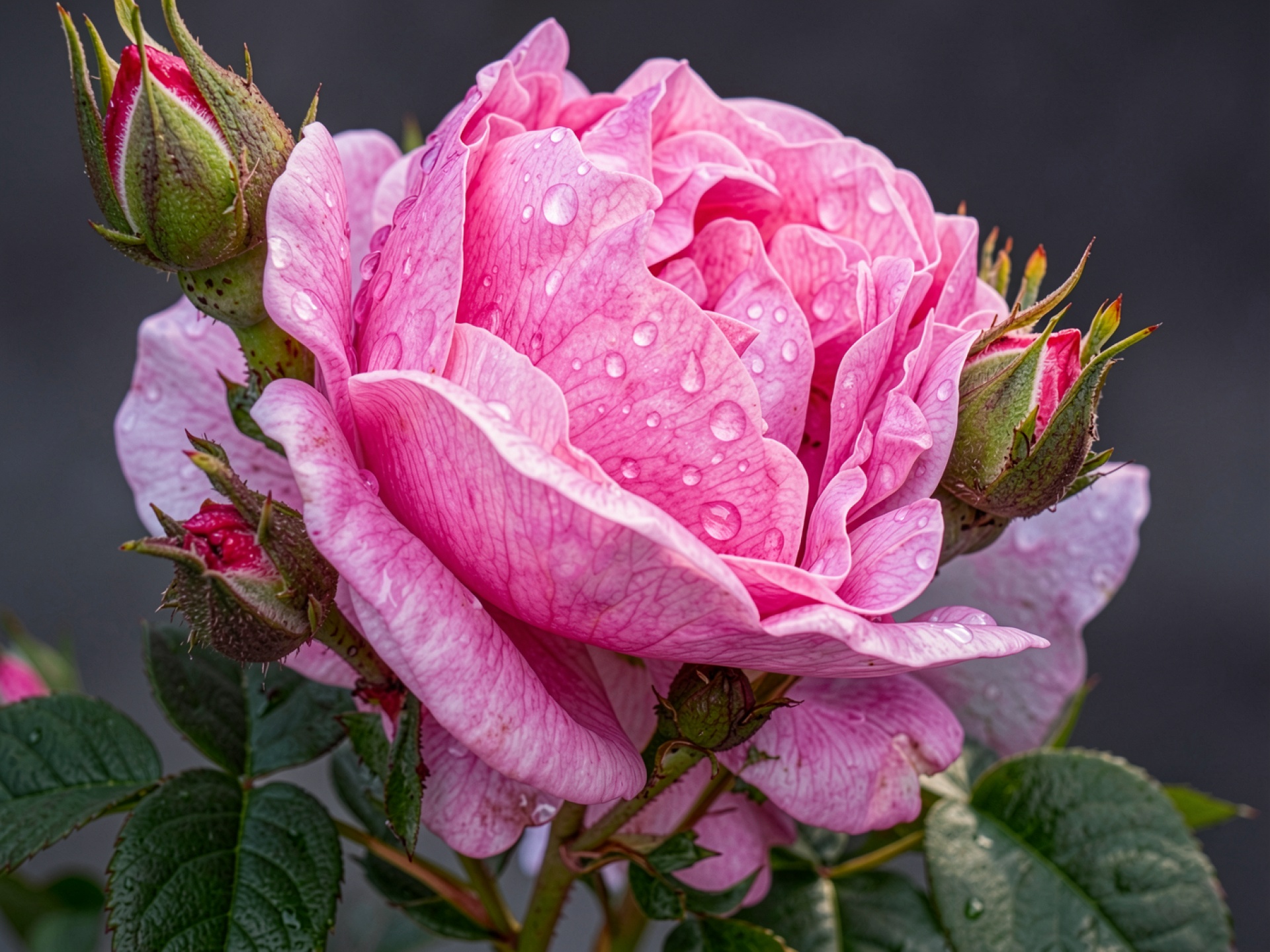 Изображение детально передает бархатистую текстуру лепестков и сферическую форму водяных капель. Мягкое освещение создает плавные градиенты от насыщенного розового к светлому оттенку, а глубокие тени в центре цветка подчеркивают объем. Темный однотонный фон обеспечивает высокий контраст, выделяя четкие контуры бутонов и прожилки зеленых листьев. Перед загрузкой доступен удобный предпросмотр для оценки качества отображения на вашем экране.