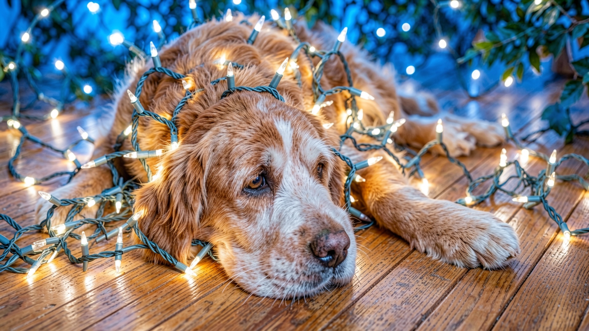 Изображение детально передает текстуру густой шерсти собаки и матовый блеск деревянных досок пола. Теплый свет от лампочек создает мягкие блики на морде пса и глубокие контрастные тени в складках гирлянды. Градиенты фона плавно переходят от темно-синих тонов к золотистому свечению, что подчеркивает объем композиции. Сайт предоставляет удобный предпросмотр перед скачиванием для оценки качества на экране.