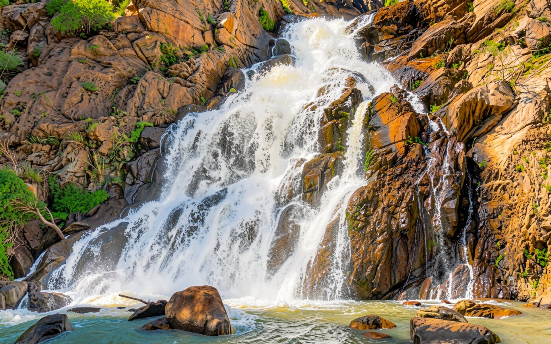 Изображение детально передает текстуру мокрых камней и динамику падающей воды. Контраст между белой пеной потока и теплыми охристыми тонами скал создает глубокий визуальный объем. Плавные градиенты на заднем плане и четкие блики на поверхности воды подчеркивают естественное освещение сцены. На сайте доступен удобный предпросмотр перед загрузкой, чтобы оценить качество отображения на вашем экране.