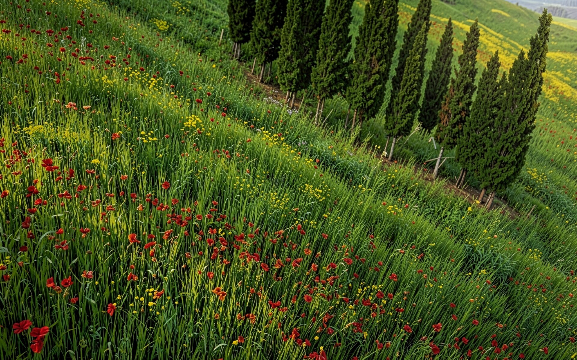 Композиция построена на диагональных линиях, что создает динамику и глубину кадра. В центре внимания находятся маки (Papaver rhoeas) и стройные кипарисы, которые являются визитной карточкой этого региона. Технические параметры изображения обеспечивают четкость каждой детали даже при масштабировании до 4K. Согласно данным botanicgardens.org, сочетание открытых лугов и кипарисовых аллей формирует уникальный микроклимат, влияющий на яркость окраса местной флоры.