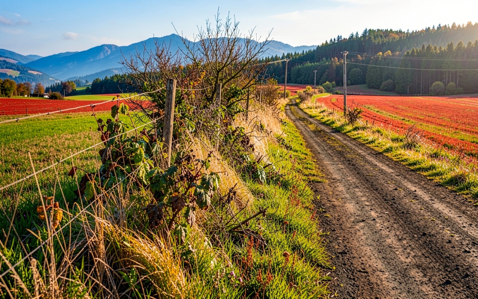 Технически композиция построена на контрасте теплых красных оттенков полей и холодных синих тонов удаленных хребтов. Освещение соответствует режиму золотого часа, что создает мягкие тени и подчеркивает текстуру почвы и сухой травы. Согласно данным color-hex.com, сочетание комплементарных цветов повышает визуальное восприятие глубины пространства. Изображение подходит для экранов с высоким PPI благодаря четкой детализации объектов среднего плана, таких как деревянные столбы ограждения и лесной массив.
