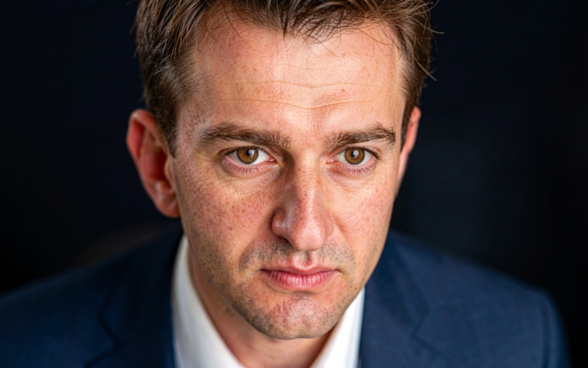 Техническое исполнение кадра фокусируется на микротекстуре кожи и четкости линий ткани пиджака. Освещение создает направленные блики на лице, подчеркивая рельеф и создавая глубокие тени в области глаз. Градиент темного фона плавно уходит в полную черноту, что исключает визуальный шум и акцентирует внимание на центральном объекте. Перед загрузкой доступен удобный предпросмотр для оценки качества отображения на вашем экране.