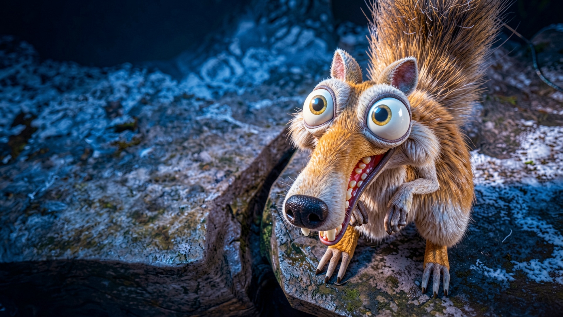 Изображение детально передает текстуру шерсти, где каждый волосок отделен от другого за счет направленного освещения. Контрастные блики в глазах создают эффект живого взгляда, а глубокие тени на коре дерева подчеркивают объем сцены. Плавные градиенты синего и коричневого цветов в фоне создают необходимую глубину пространства. На сайте доступен удобный предпросмотр перед скачиванием для оценки качества на экране.