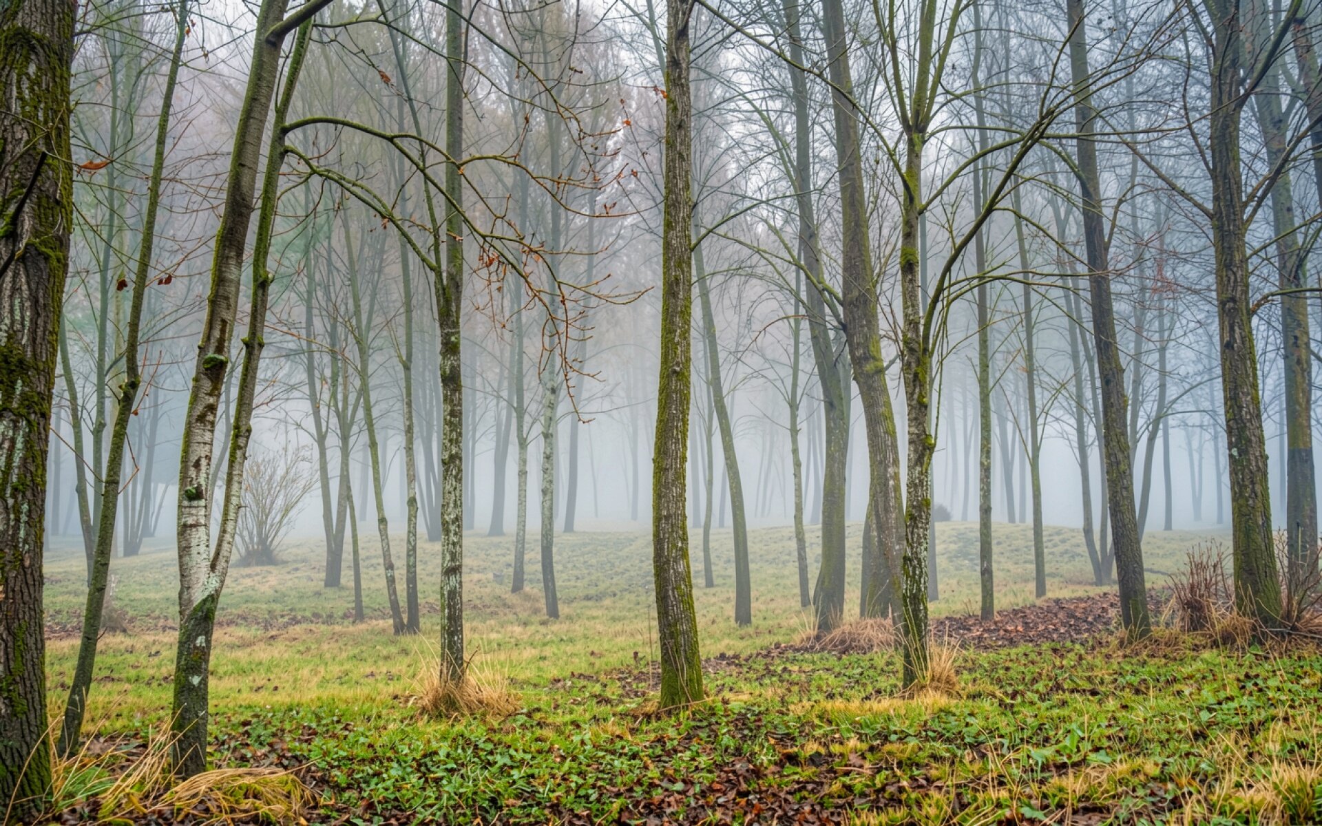 Туманный осенний лес с тонкими серыми деревьями обои