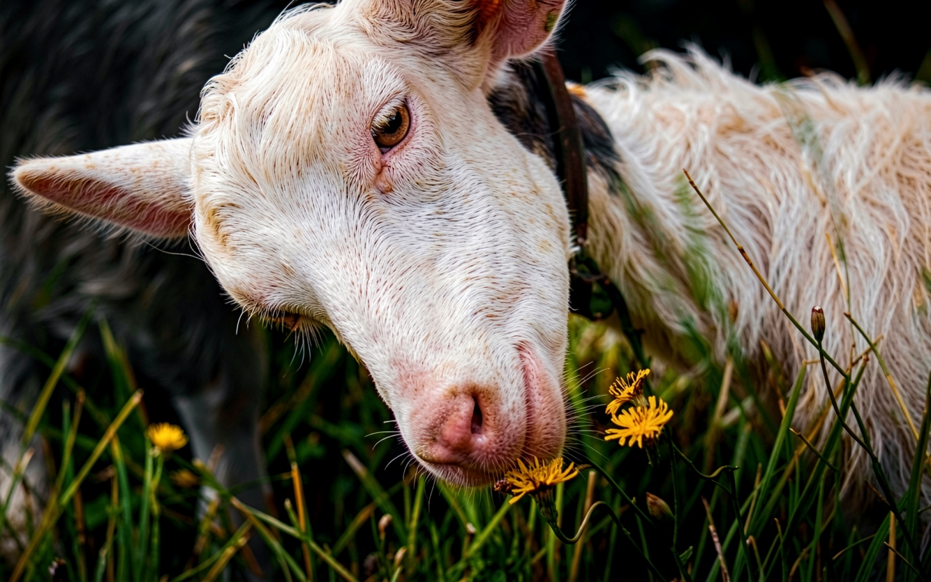 Скачайте JPG файл обоев Белый теленок среди желтых одуванчиков в траве на нашем сайте – и вот почему: другие сайты обрезают края, но у нас доступен полный кадр.