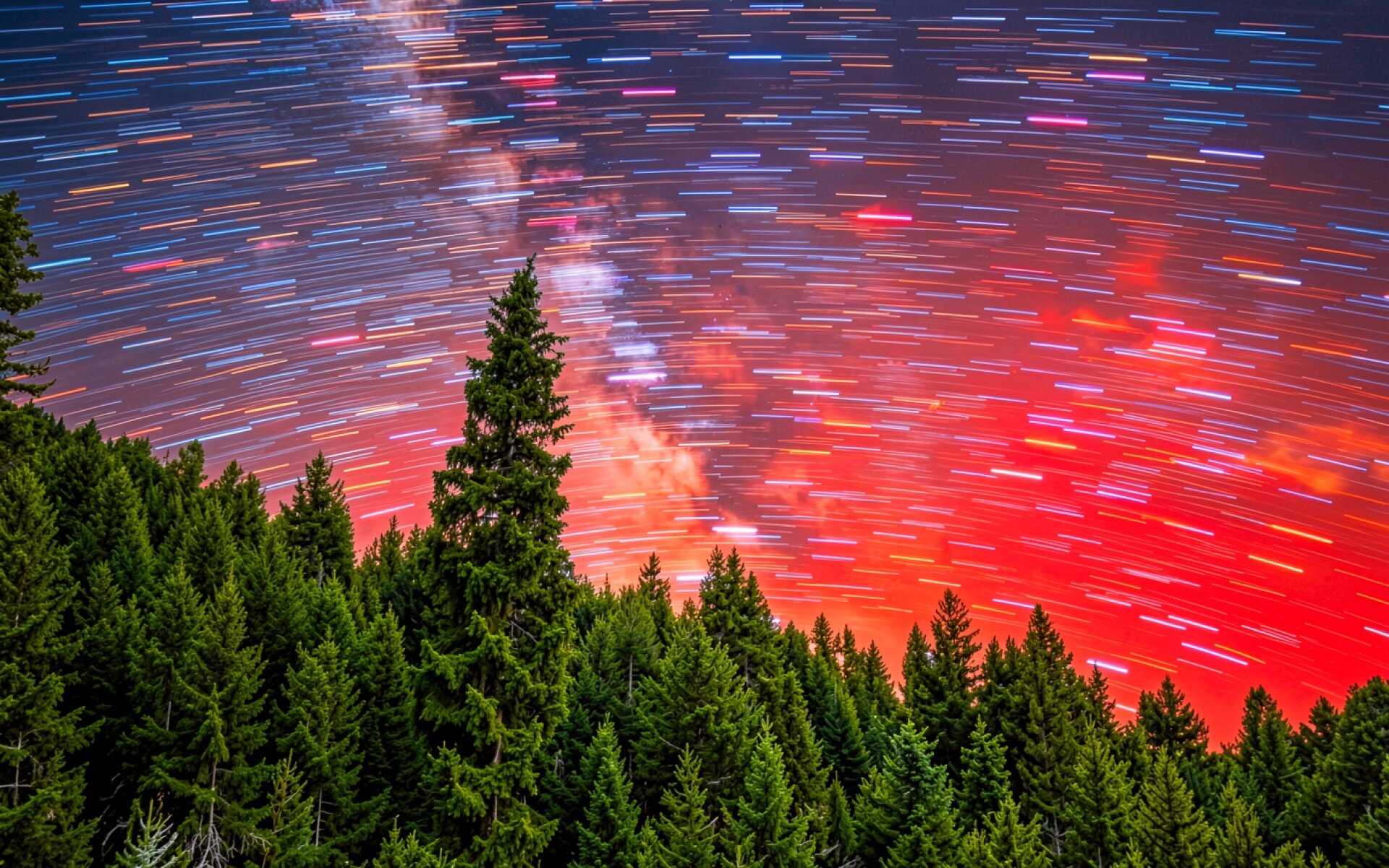 Изображение характеризуется высокой детализацией хвои и четкими контурами верхушек деревьев на фоне яркого градиента. Световые полосы создают динамический ритм, где переходы от глубокого синего к насыщенному красному подчеркивают контраст между земным ландшафтом и космосом. Мягкие тени в массиве леса уравновешивают интенсивные блики звездных путей. На сайте доступен удобный предпросмотр перед загрузкой для оценки качества на экране.