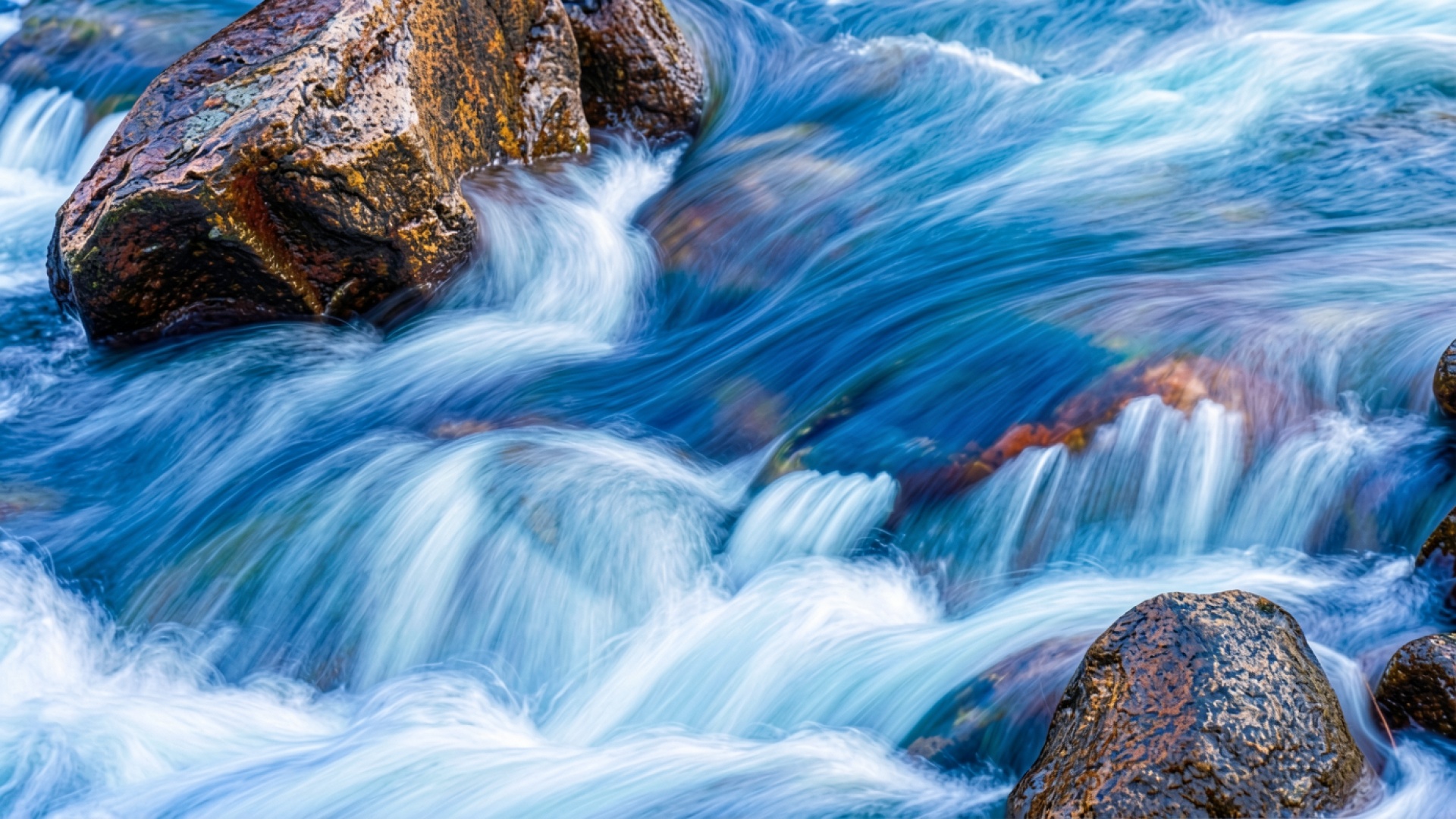 Изображение детально передает текстуру мокрых гранитных валунов и динамику водного потока. Освещение создает мягкие блики на поверхности воды, а глубокие тени подчеркивают объем камней. Плавные градиенты синего и бирюзового оттенков создают эффект глубины и чистоты природной среды. На сайте предусмотрен удобный предпросмотр перед загрузкой для оценки качества отображения на вашем экране.