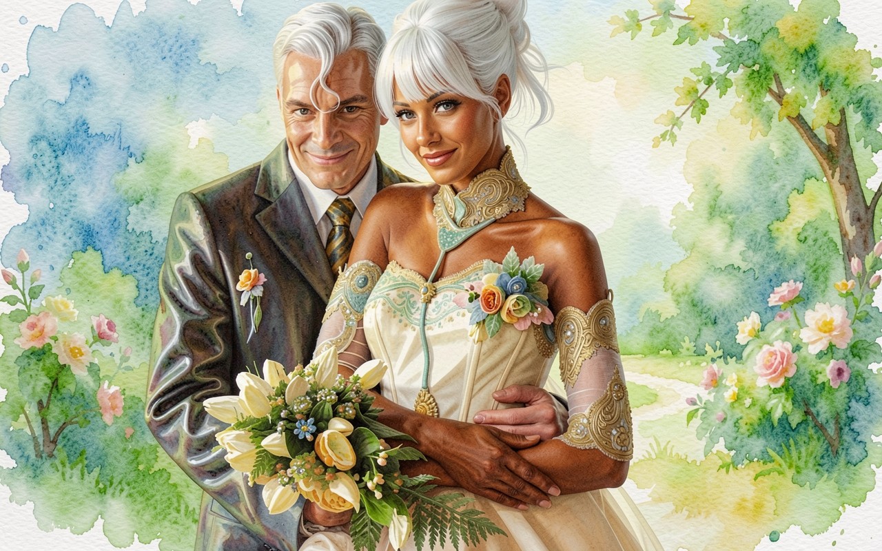 Изображение отличается мягкой проработкой текстур ткани свадебного платья и костюма. Освещение имитирует естественный дневной свет с плавными переходами в тенях и акцентами на бликах белых волос героев. Фон выполнен в технике размытых акварельных пятен, создающих глубину пространства сада. На сайте доступен удобный предпросмотр перед загрузкой для оценки качества отображения на экране.