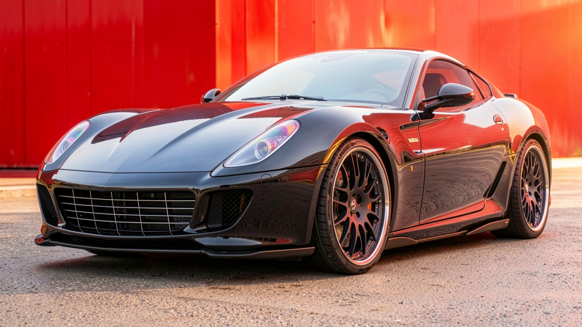 Скачайте изображение черного суперкара в высоком разрешении для использования в качестве обоев рабочего стола, чтобы подчеркнуть статус и динамику вашего интерфейса. Данный кадр демонстрирует безупречную работу с контрастом: глубокий черный цвет кузова противопоставлен насыщенному красному индустриальному фону, что создает визуальный акцент на геометрии автомобиля.