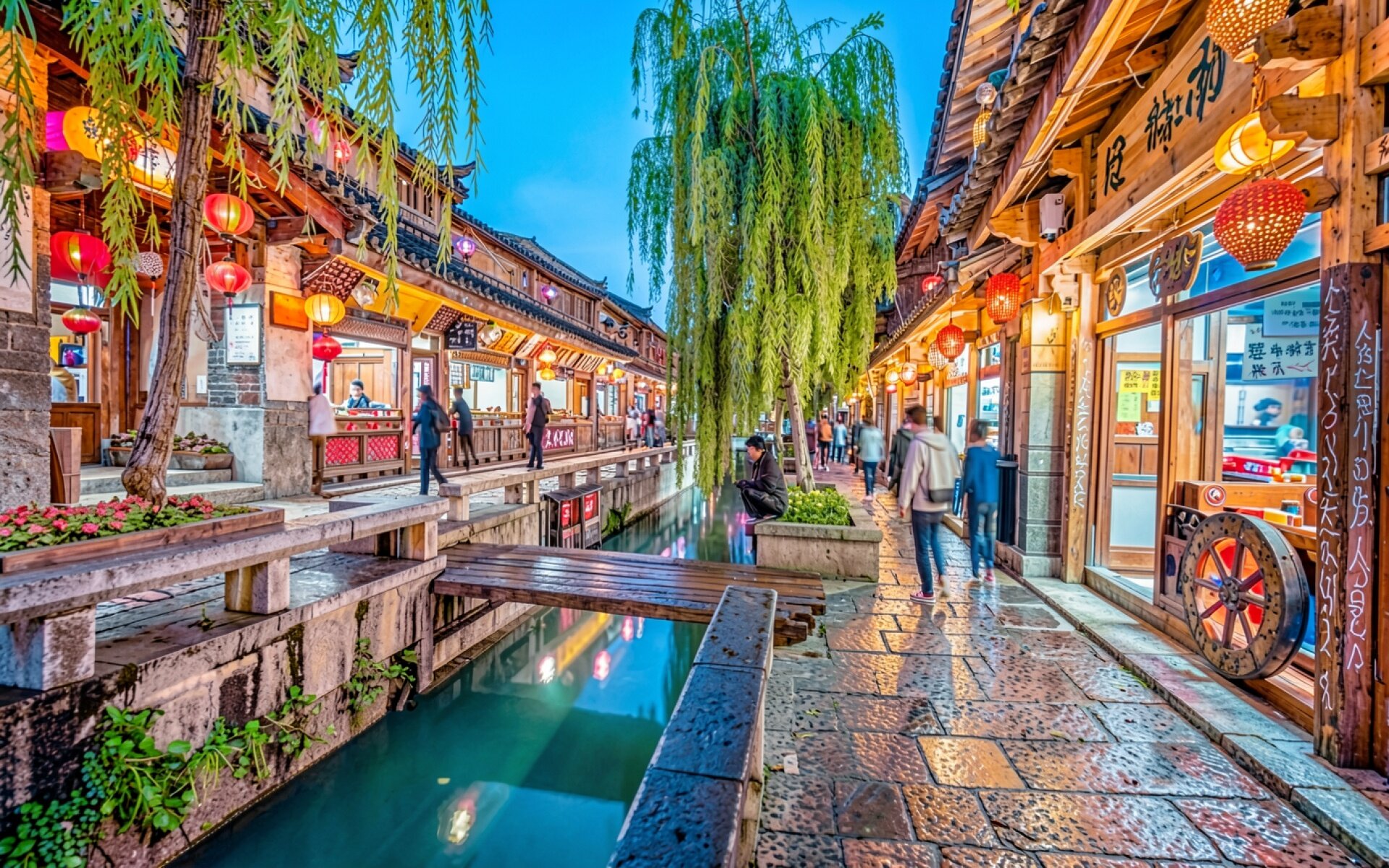 Техническое исполнение кадра подчеркивает текстуру старого дерева и влажного камня мостовой. Освещение создается за счет контраста между глубоким синим цветом сумеречного неба и теплыми оранжевыми бликами от фонарей. Градиенты на поверхности воды отражают архитектурные элементы, а мягкие тени в нишах зданий добавляют сцене объем. На сайте предусмотрен удобный предпросмотр перед загрузкой для оценки качества отображения на вашем экране.
