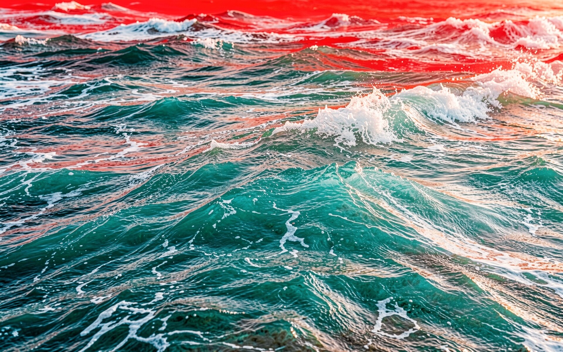 Техническое исполнение кадра акцентирует внимание на динамике воды. Текстура пены и брызг передана через резкие белые блики, которые контрастируют с глубокими бирюзовыми градиентами в толще волны. Освещение создает выраженные тени в углублениях водной глади, а красный фон неба формирует насыщенный цветовой контраст на гребнях. На сайте доступен удобный предпросмотр перед загрузкой, чтобы оценить качество отображения цветов на вашем экране.