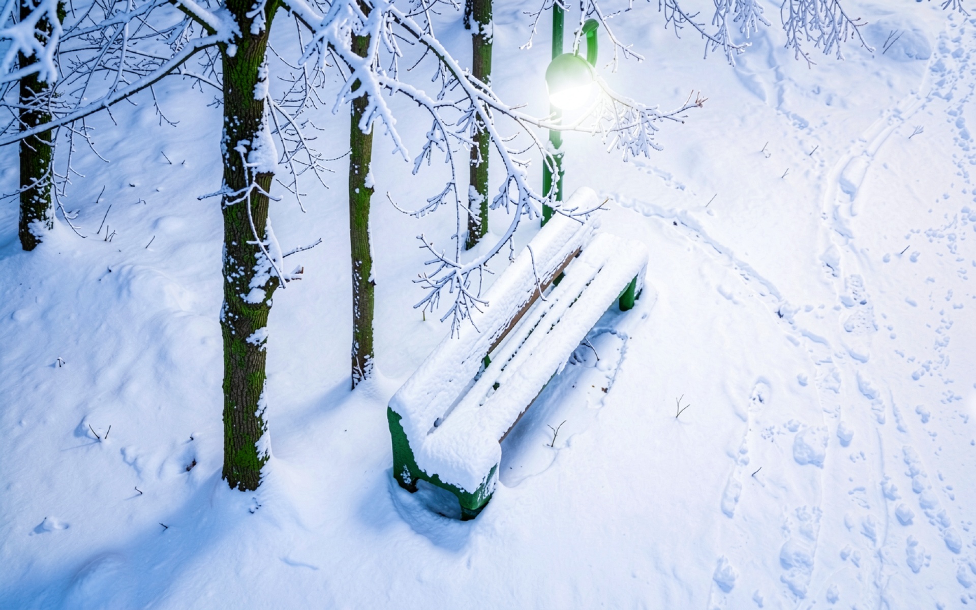 Техническое исполнение кадра акцентирует внимание на контрасте между холодным белым снегом и темной корой деревьев. Освещение от фонаря создает мягкий градиент в верхней части композиции, формируя выраженные блики на заснеженных ветвях и глубокие тени под сиденьем скамьи. Текстура свежевыпавшего снега передана с высокой точностью, что подчеркивает объем объектов. Перед загрузкой доступен удобный предпросмотр для оценки качества отображения на вашем экране.