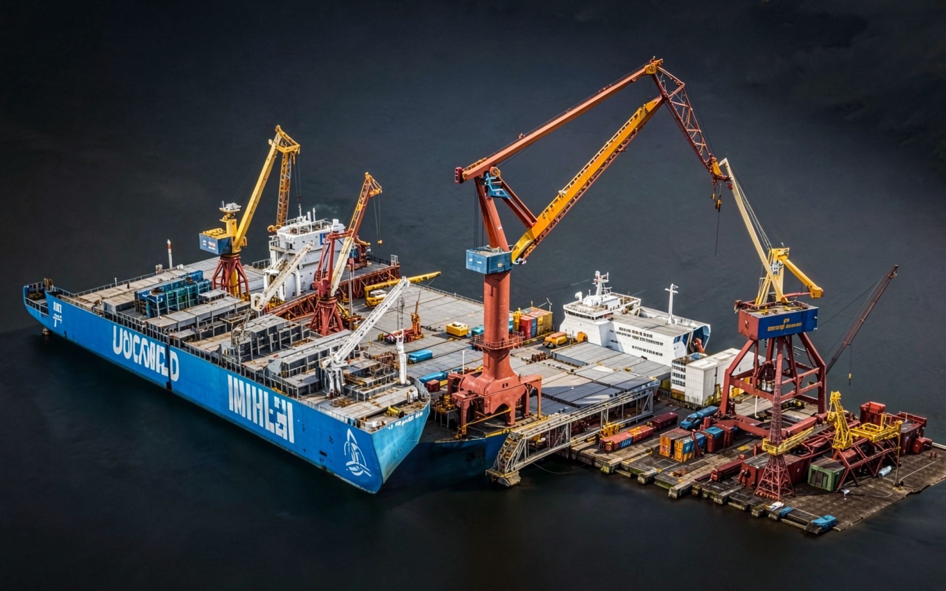Изображение детально передает текстуру окисленного металла синего корпуса и матовые поверхности портовых кранов. Освещение создает четкие контрасты между яркими желтыми элементами механизмов и глубокими тенями в трюмах. Градиенты темного фона подчеркивают индустриальный стиль сцены, а блики на металлических тросах добавляют объема. На сайте доступен удобный предпросмотр перед скачиванием для оценки качества на экране.